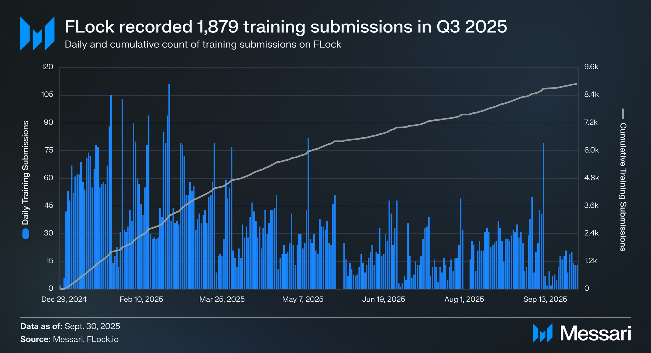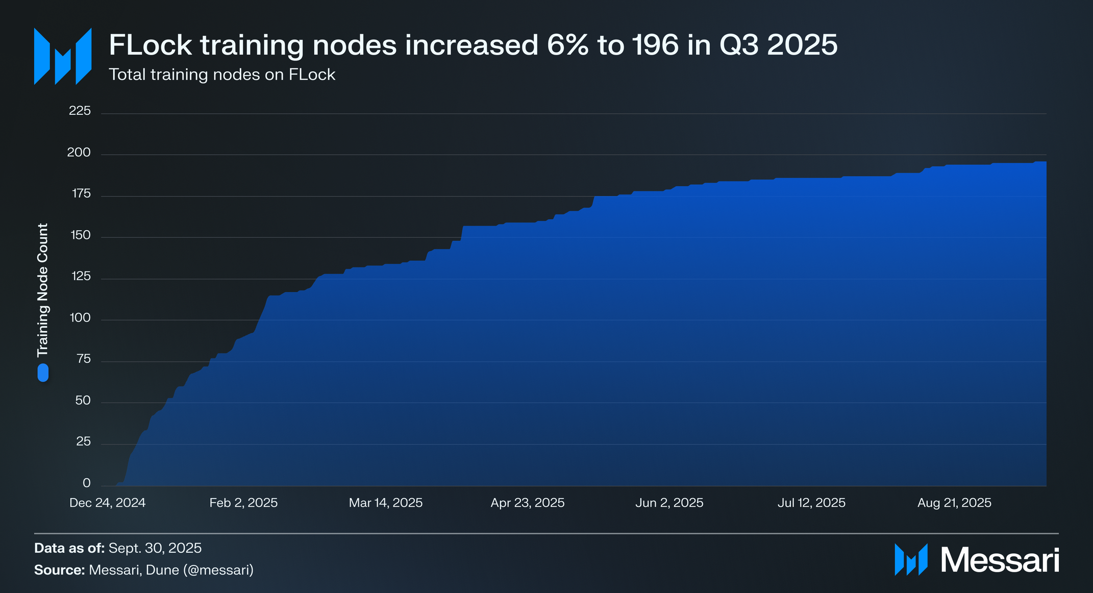 훈련 노드는 2025년 2분기 말 185개에서 2025년 3분기 말 196개로 성장하여 전분기 대비 5.9% 증가했다. 훈련 노드는 노드 운영자와 위임자를 위한 인센티브를 강화한 gmFLOCK 도입 및 AI Arena V2 업그레이드 이후 계속 상승 추세를 보이고 있다. 훈련 노드는 작업 생성자가 시작한 AI 작업을 훈련하고 미세 조정함으로써 FLock 생태계에서 중요한 역할을 한다.