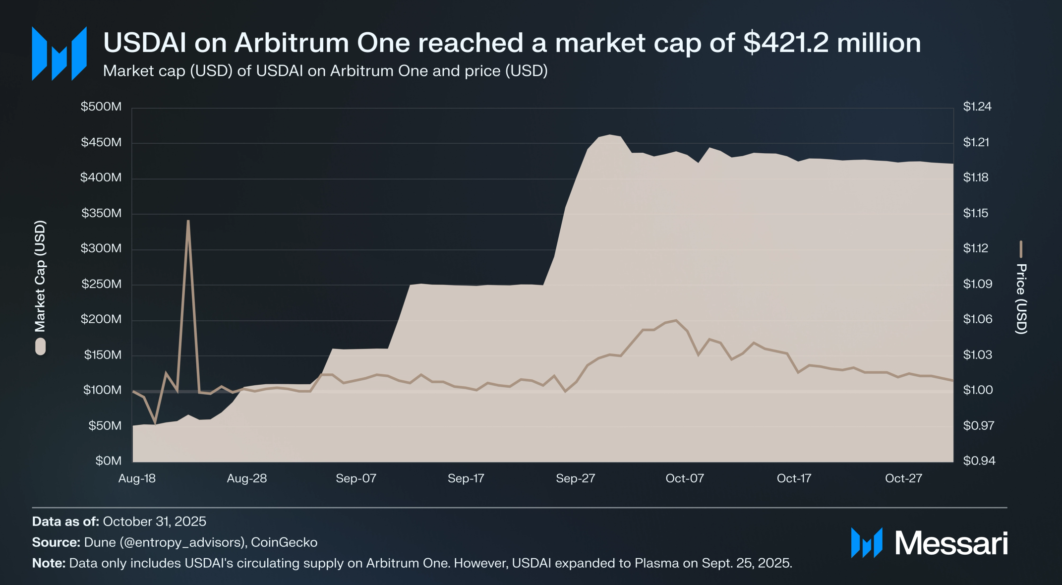 USDai의 미국 달러 페그는 다른 합성 달러에 비해 상당히 벗어났다. 그러나 편차는 상방향이었으며, USDai는 2025년 10월 31일 1.015 달러에 거래되었는데, 이는 예치가 제한되고 USDai에 대한 수요가 현재 최대 공급량인 5억 8000만을 초과했기 때문이다. 수요는 USD.AI의 알로(Allo) 포인트 프로그램에 의해 주도되었지만, 프로토콜이 위치한 교차점, 즉 스테이블코인과 AI도 반영한다. 서클(Circle)의 IPO 성공과 오픈AI의 최근 5000억 달러 가치 평가는 투자자들이 이러한 부문에 관심이 있음을 강조하며, USD.AI는 두 가지 모두에 대한 노출을 제공한다.