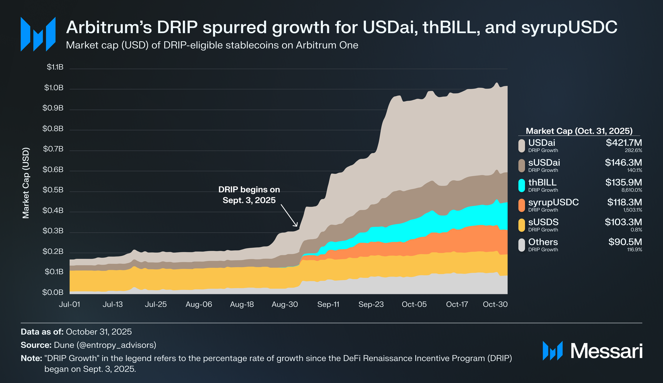 DRIP 시즌 1은 리퀴드 스테이킹 ETH에서 주목할 만한 성장을 촉진하지 못했다. 그러나 아비트럼 원에서 스테이블코인의 시가총액, 유동성, 차입에 극적인 증가를 초래했다. DRIP 적격 스테이블코인의 시가총액(USD)은 프로그램이 시작된 2025년 9월 3일 이후 229.4% 증가하여 10억 2000만 달러에 도달했다. 시가총액 증가는 USDai(282.6% 증가), sUSDai(140.1% 증가), thBILL(8610% 증가), syrupUSDC(1503.1% 증가)가 주도했다.