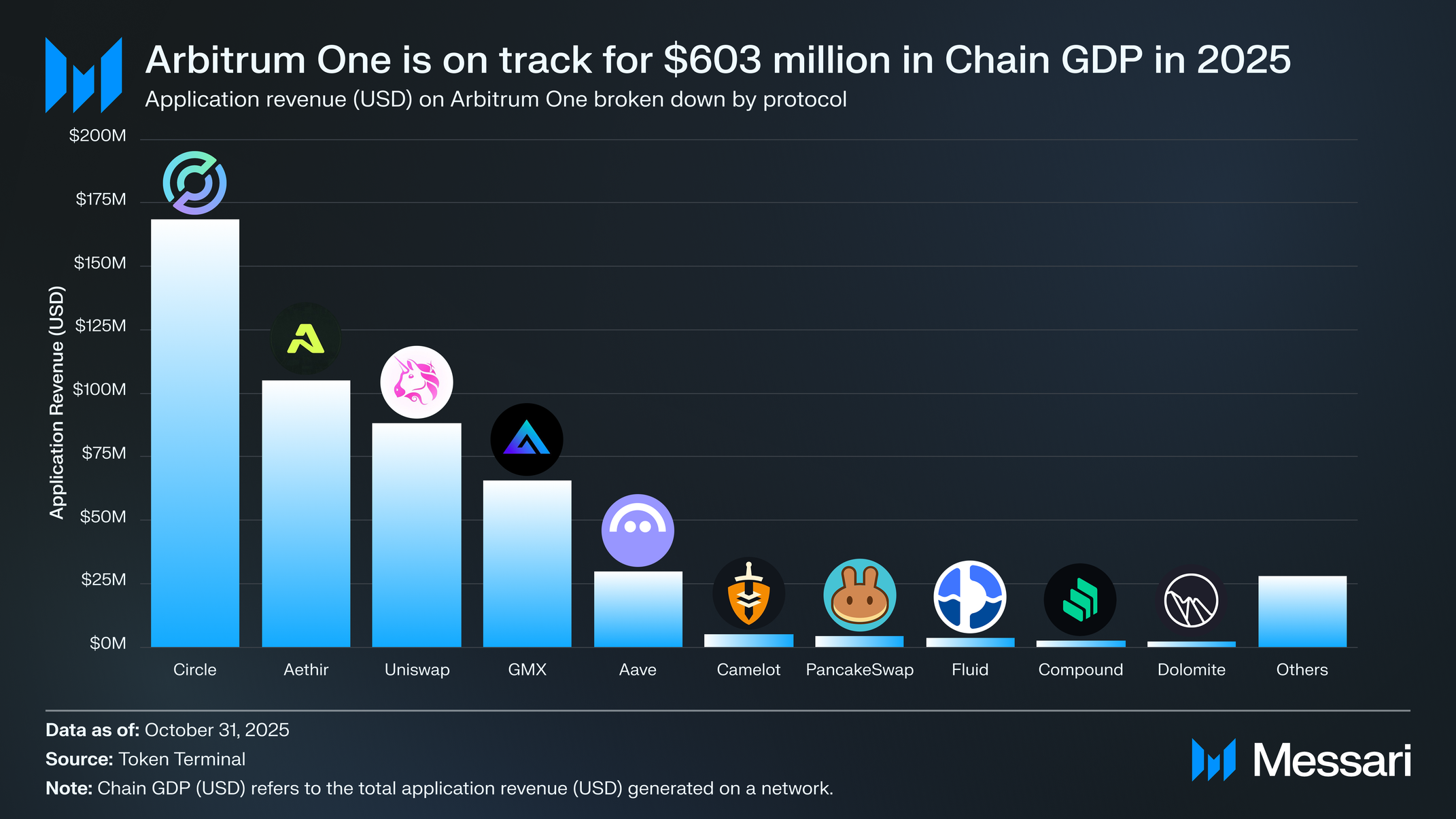 네트워크에서 생성된 총 애플리케이션 수익을 의미하는 아비트럼 원의 체인 GDP(USD)는 2025년 10개월 동안 5억 250만 달러였다. 유니스왑, GMX, 에이브는 아비트럼 원 체인 GDP의 36.5%를 차지한다. 연간 기준으로, 아비트럼 원의 애플리케이션들은 2025년에 6억 300만 달러를 창출할 궤도에 있으며, 이는 연간 43% 성장을 초래할 것이다.