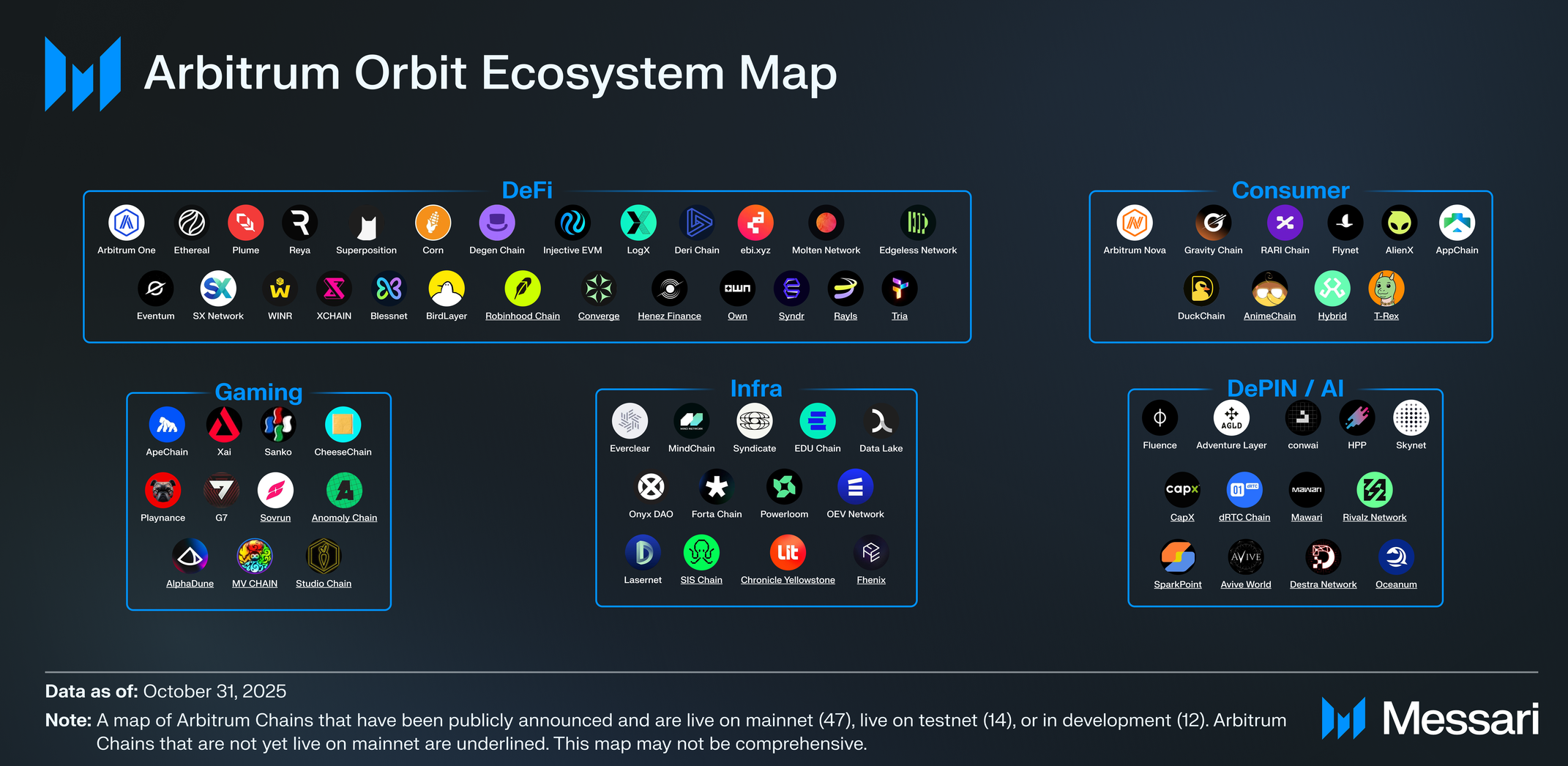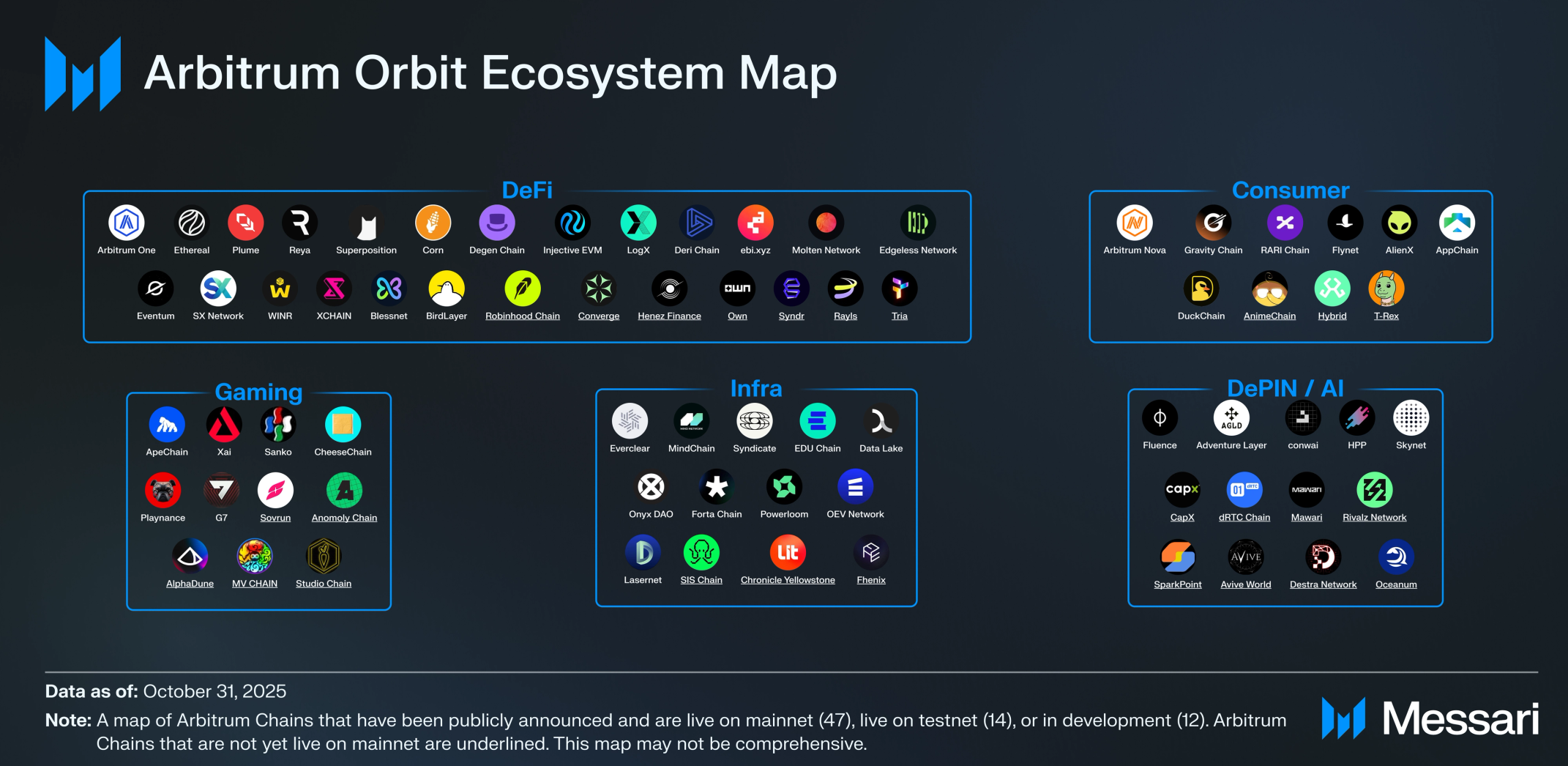 2025년 10월 31일 기준으로, 아비트럼 오빗 생태계는 메인넷에서 라이브로 공개 발표된 47개의 아비트럼 체인으로 구성되며, 메사리(Messari)가 공개적으로 검증할 수 있는 테스트넷에 있는 14개와 개발 중인 12개가 추가로 있다. 누적적으로 아비트럼 오빗은 166억 3000만 달러의 TVL, 140만 명 이상의 주간 활성 주소, 23억 6000만 건의 전체 거래를 보유하고 있으며, 모든 L2 거래의 34%를 차지한다.