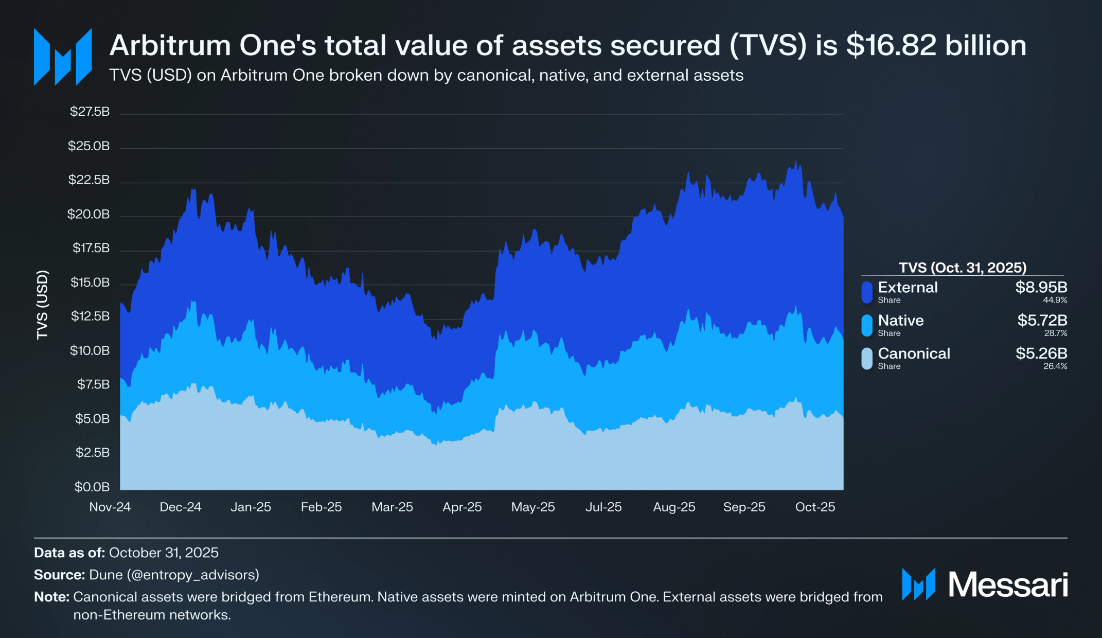 총 보안 가치(TVS)는 주어진 네트워크에 존재하는 대체 가능한 토큰 가치의 총량이며, 디파이 프로토콜에 잠겨 있든 그렇지 않든 상관없다는 점에서 TVL과 다르다. 구체적으로, TVS는 정규 브리지 토큰, 외부 브리지 토큰, 네이티브 토큰의 합으로 계산된다. 아비트럼 원의 TVS(USD)는 2025년 10월 31일 기준으로 168억 2000만 달러였다.
