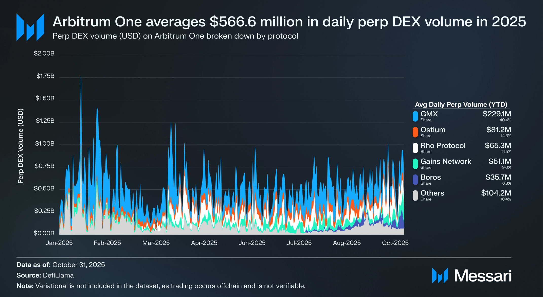 아비트럼 원의 무기한 탈중앙화 거래소(Perp DEX) 거래량(USD)은 2025년 하루 평균 5억 5170만 달러다. GMX는 아비트럼에서 최고의 무기한 DEX로 남아 있으며, 2025년 평균 일일 거래량(USD)은 2억 2110만 달러다. 그러나 거래량 점유율은 오스티움(Ostium)의 출현으로 이동했으며, 이는 암호화폐를 벗어나 확장하여 사용자들이 주식, ETF, 상품과 같은 실물 자산(RWA)을 거래할 수 있게 하는 무기한 선물 거래소다. 오스티움은 360만 달러를 조달했으며 2025년 10월 단일 월 동안 역대 최고치인 49억 달러의 거래량을 촉진했다. 오스티움을 포함한 실물 무기한 시장에 대한 개요는 메사리의 실물 자산의 퍼프화에 대한 보고서를 참조하라.