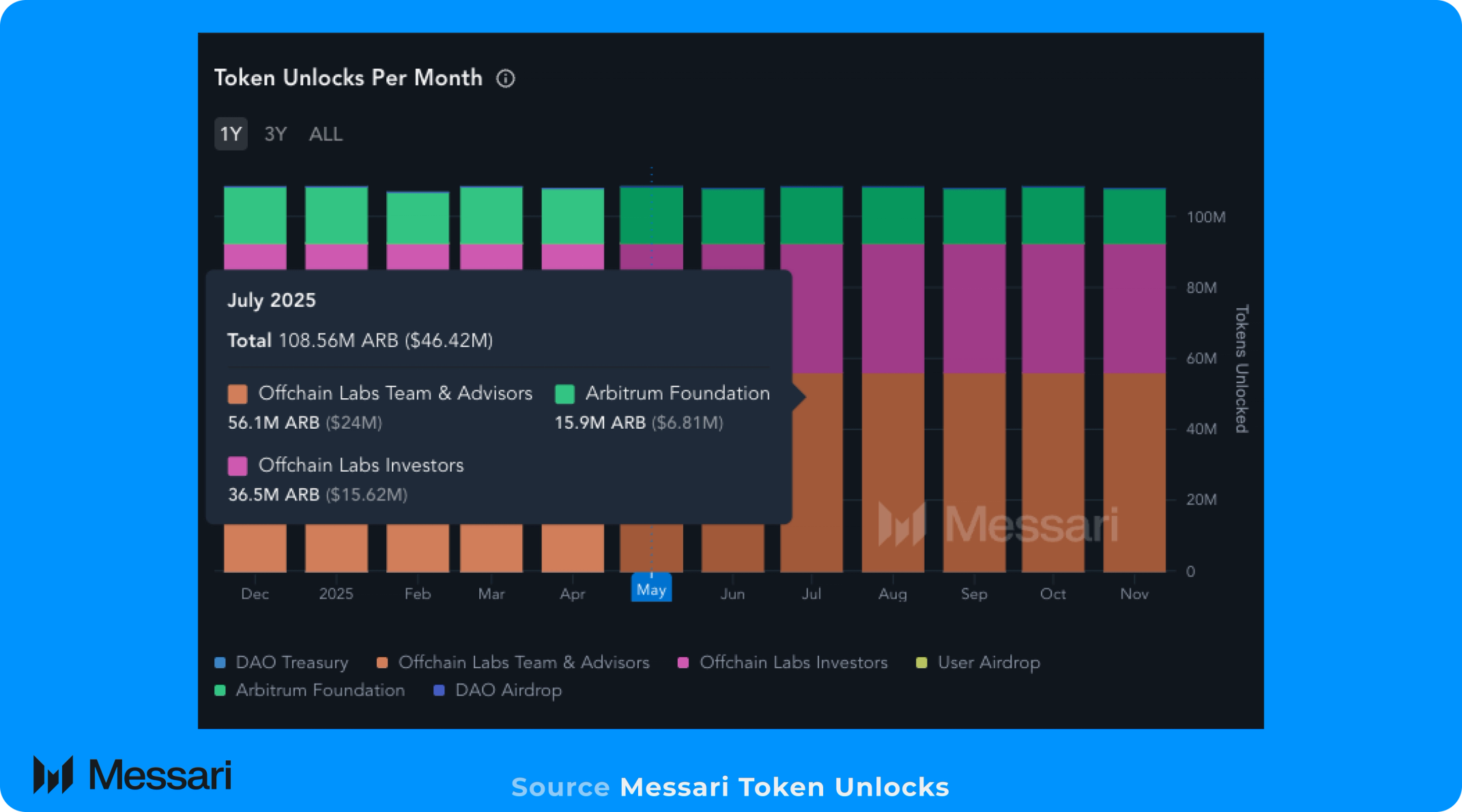 ARB는 월 1억 860만 ARB(총 토큰 공급량의 1.1%)의 비율로 베스팅되고 있으며, 2027년 3월까지 모든 할당이 완전히 베스팅될 예정이다. 그러나 2025년 3월, 오프체인 랩스는 회사가 재량에 따라 공개 시장에서 ARB 토큰을 구매할 전략적 구매 계획을 발표함으로써 아비트럼에 대한 헌신을 강화했다.