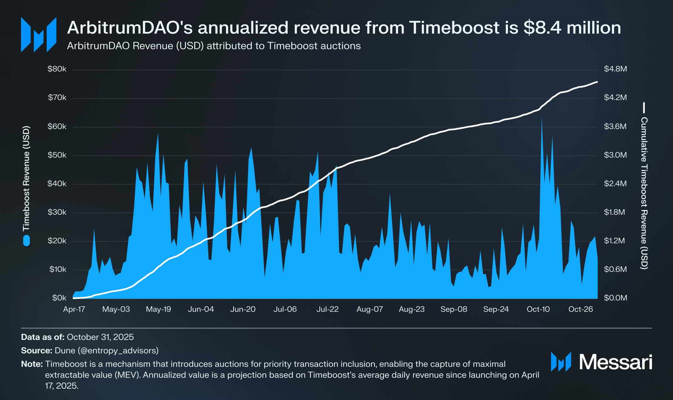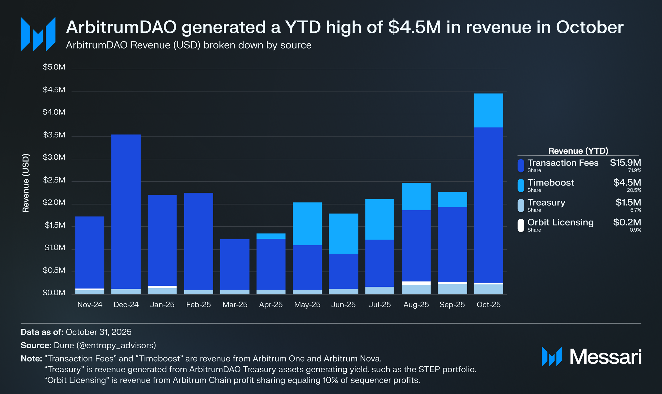 2025년 10월 31일 기준으로, 아비트럼다오는 이러한 수익원에 기인하는 연초 대비 수익(USD)으로 1590만 달러를 받았지만, 모든 출처의 총 연간 수익은 2025년에 2660만 달러로 예상된다.