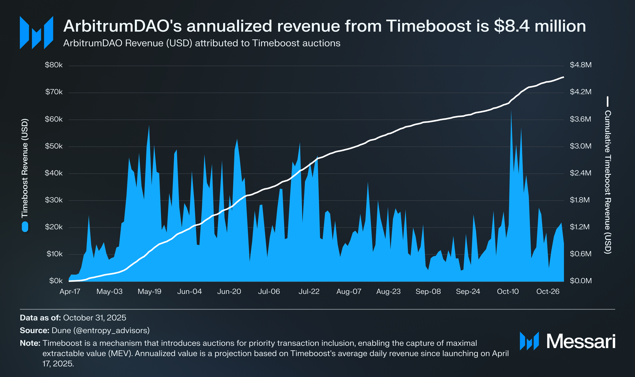 타임부스트는 빠르게 아비트럼다오의 주요 수익원으로 부상했다. 2025년 6월 한 달 동안 가장 큰 수익원이 되어 거래 수수료(89만 700달러 대 78만 1800달러)를 뒤집었지만, 이후 정상화되었다. 2025년 10월 31일 기준으로, 타임부스트는 역대 수익(USD)으로 450만 달러를 창출했다. 하루 평균 2만 3000달러로, 연간 수익(USD) 예상치는 840만 달러가 된다. 이 수익의 대부분인 97%는 아비트럼다오에 분배되며, 나머지 3%는 아비트럼 개발자 길드로 간다.