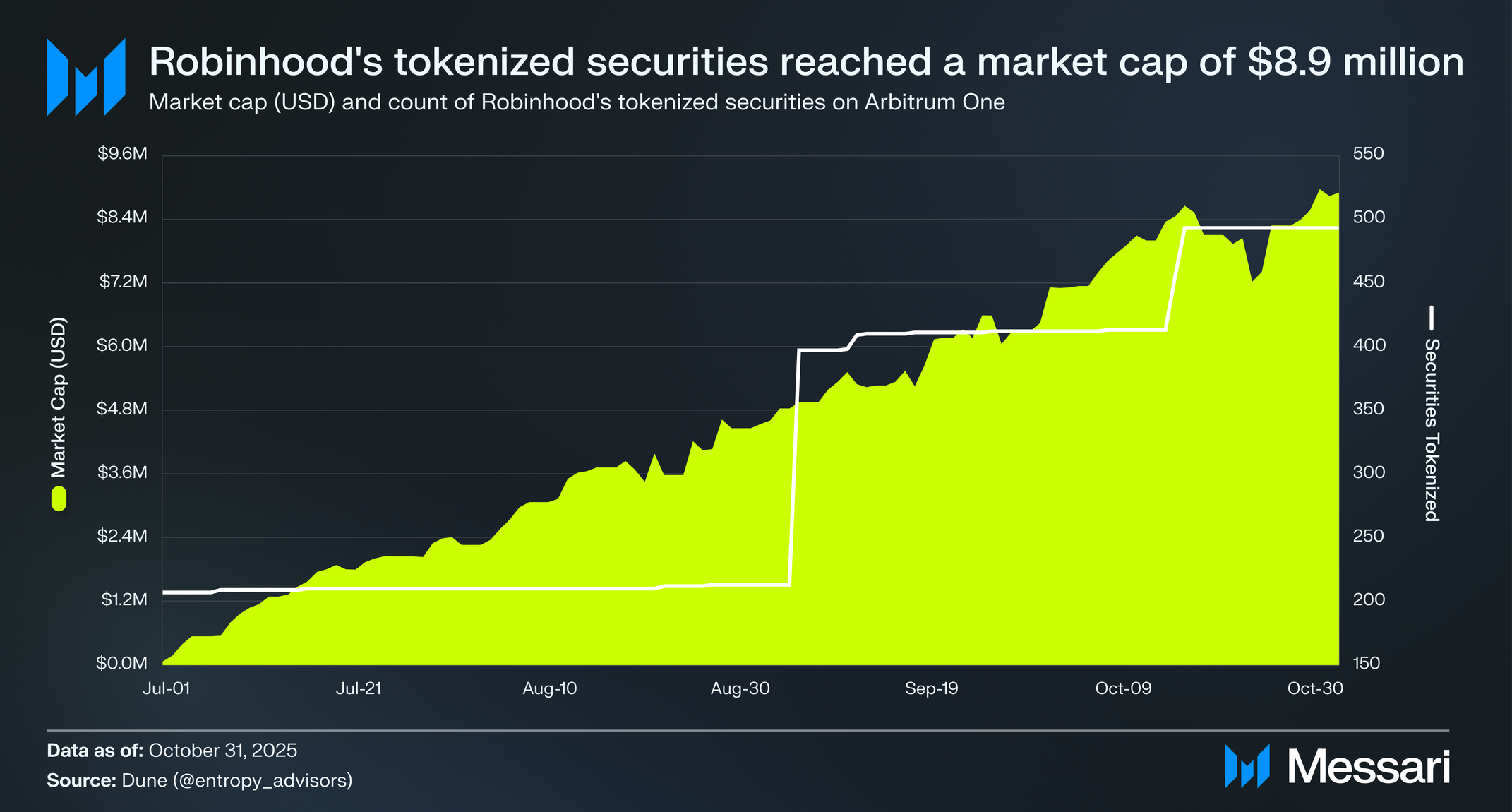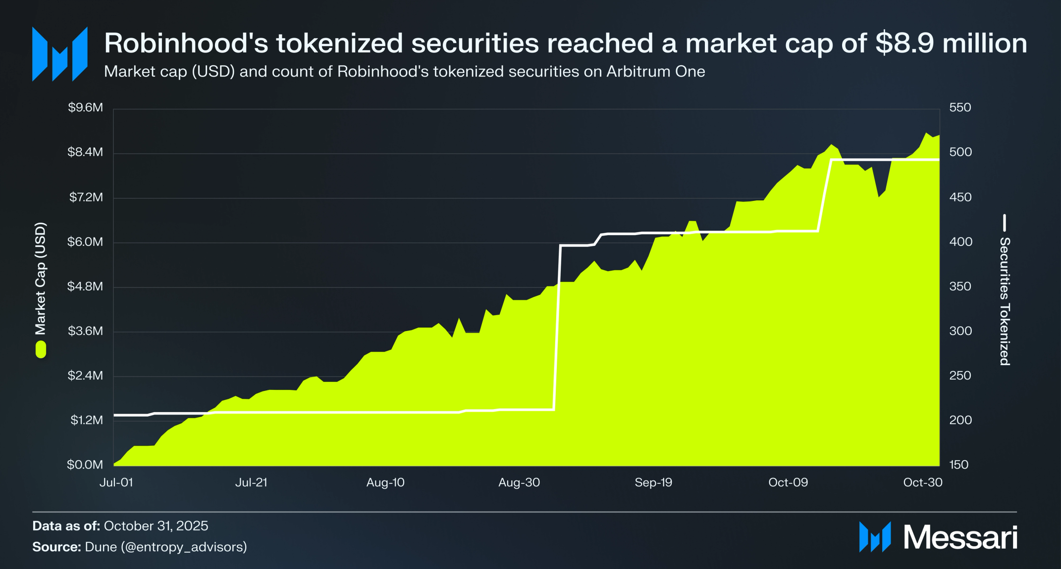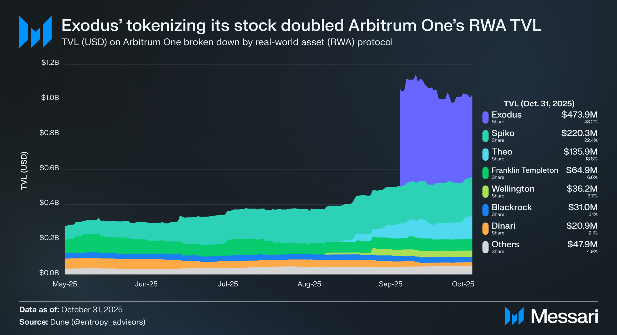 • 엑소더스(Exodus): 나스닥(Nasdaq)에 상장된(EXOD) 공개 거래 암호화폐 지갑 제공업체가 2025년 9월 29일 아비트럼 원에 클래스 B 주식을 토큰화했다. 시큐리타이즈(Securitize)를 통해 론칭된 토큰 EXODB는 엑소더스 주식의 직접 소유권을 나타내며, 단 한 명의 토큰 보유자와 함께 4억 7390만 달러의 시가총액(USD)에 도달하여 네트워크에서 가장 큰 RWA가 되었기 때문에 아비트럼 원의 RWA 시가총액은 그날 111.3% 증가했다.