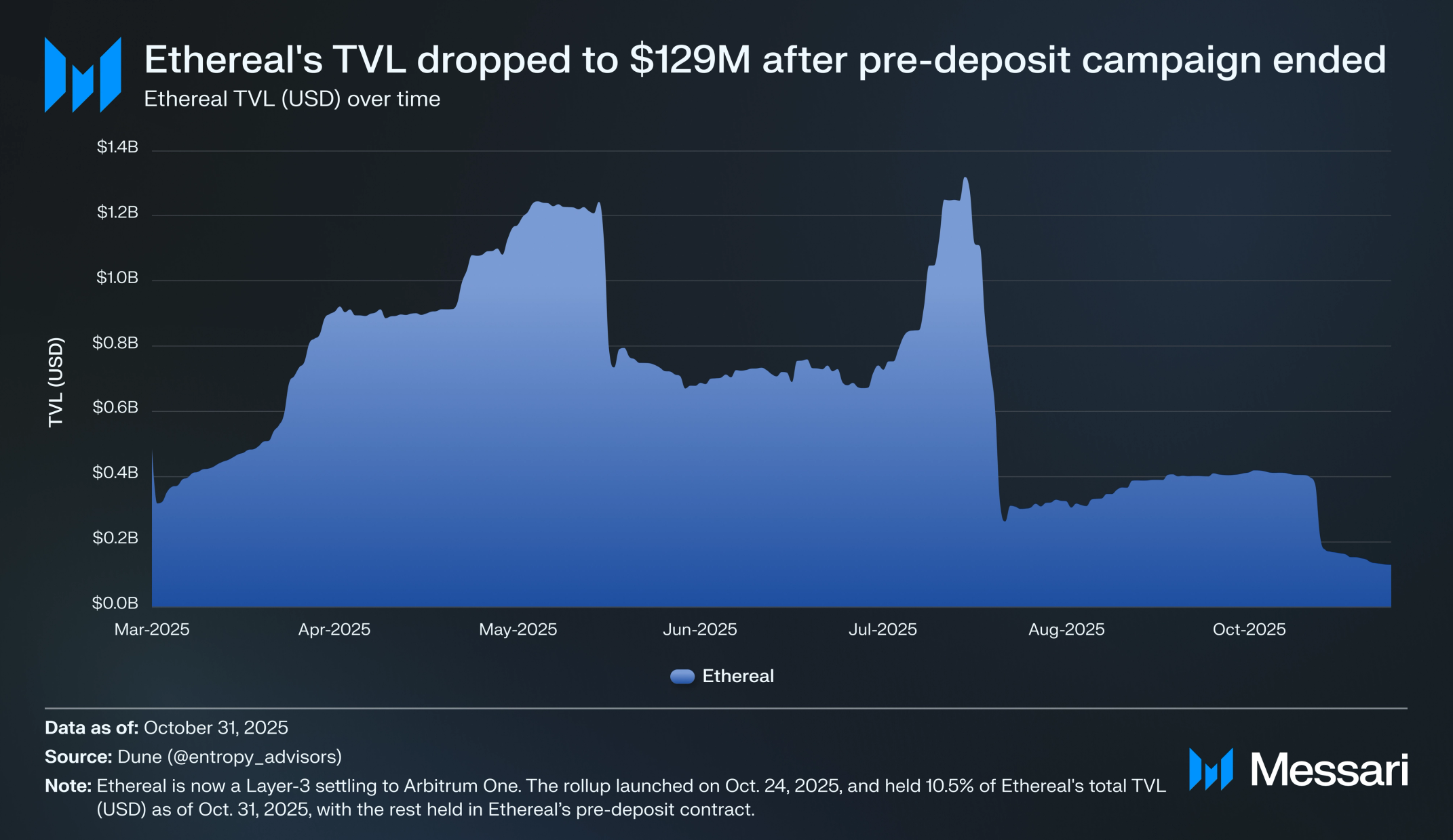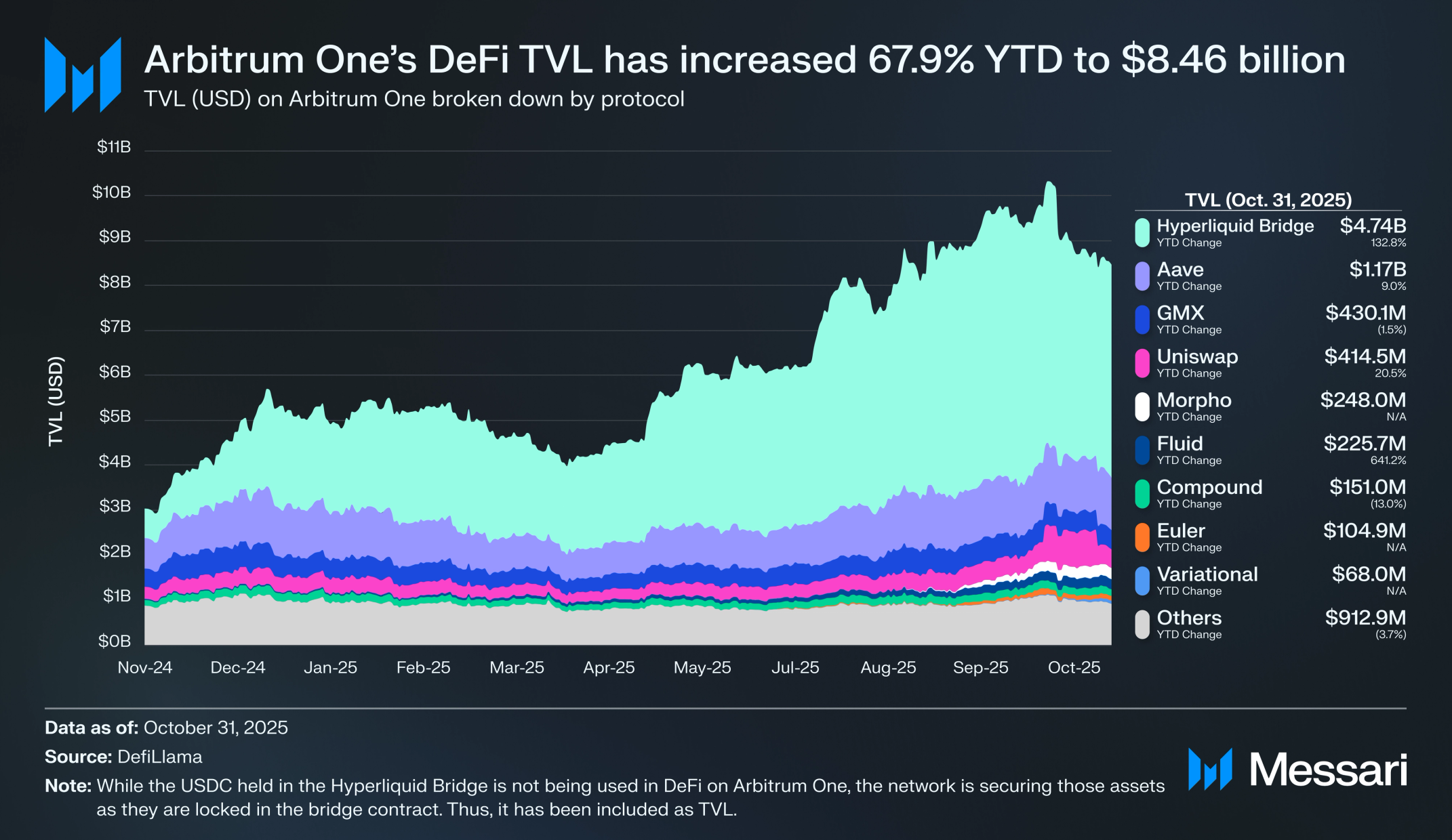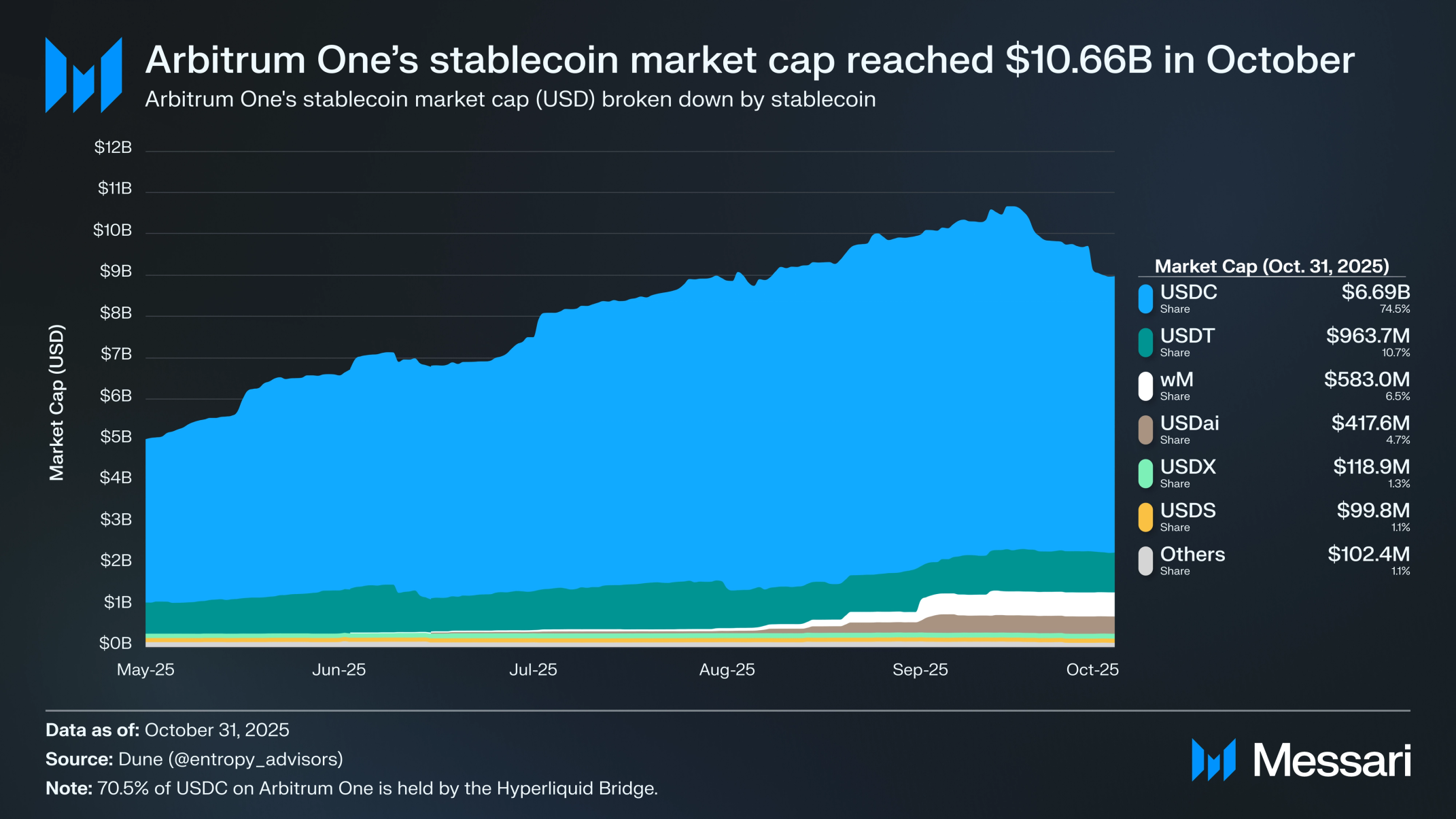 아비트럼 원의 전체 스테이블코인 시가총액(USD)은 DRIP의 혜택을 받아 2025년 10월 11일 106억 6000만 달러로 최고치를 기록한 후 월말에 89억 7000만 달러로 마감했다. 이는 모든 L2 중 가장 많지만, 연초 대비 86억 달러에서 4.4% 증가에 불과하다. 하이퍼리퀴드 브리지는 아비트럼 원의 모든 스테이블코인 중 47.5%(47억 1000만 달러)를 보유하고 있다. 이로 인해 서클은 아비트럼 원에서 최고 수익 창출 프로토콜이 되었으며, 2025년 첫 10개월 동안 네트워크에 발행된 USDC에서 1억 6840만 달러를 벌었다.