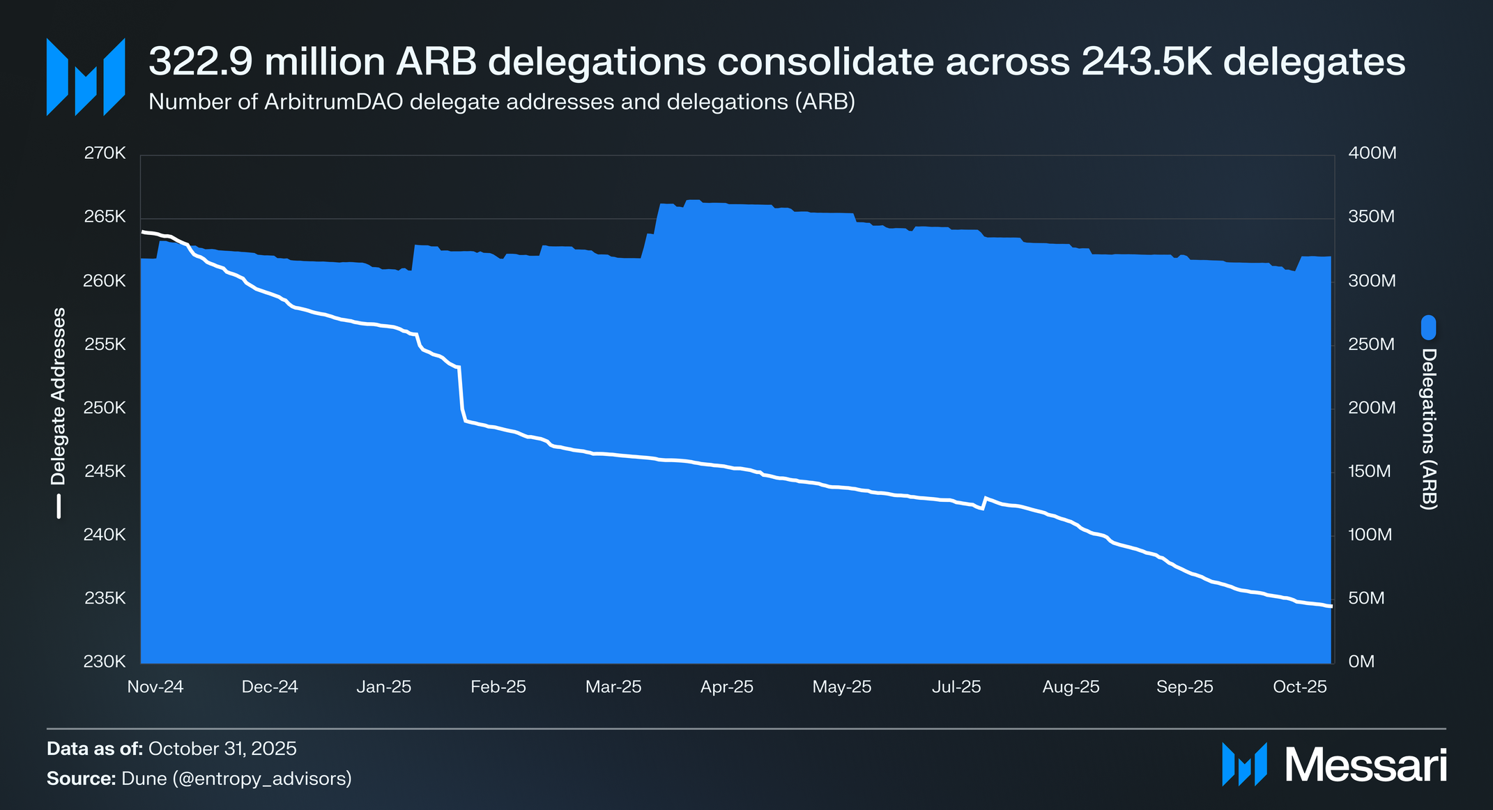 2025년 10월 31일 기준으로, 아비트럼다오 역사에서 82개의 온체인 아비트럼 개선 제안(AIP)이 있었으며, 66개가 통과되었다. 24만 3500명의 대표자가 있으며 누적 3억 2290만 ARB가 위임되었고, 이는 토큰의 순환 공급량 대비 6.7%의 위임 비율을 초래한다.
