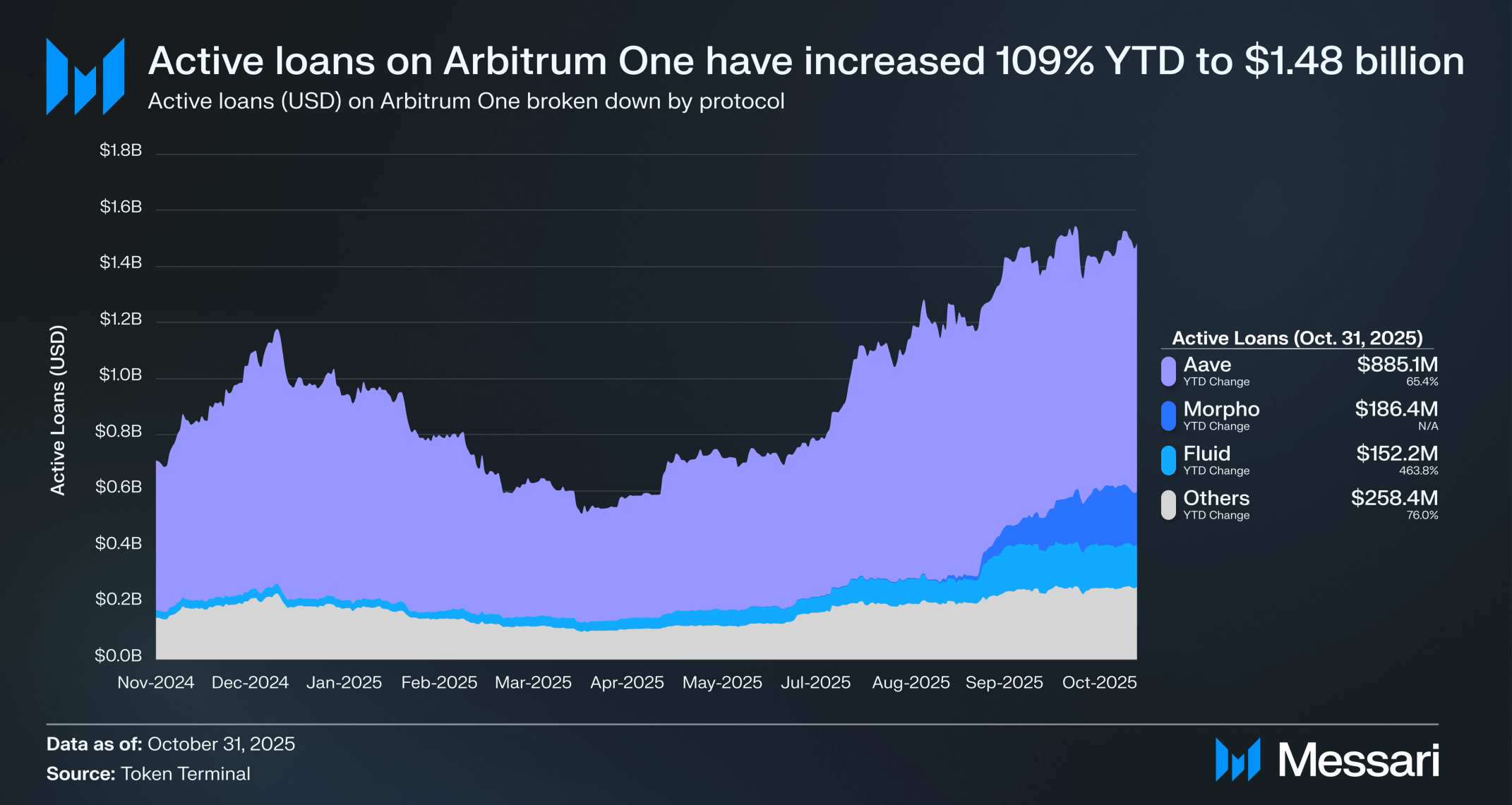 아비트럼 원의 활성 대출(USD)은 연초 대비 109% 증가하여 2025년 10월 31일 기준으로 7억 900만 달러에서 14억 8000만 달러로 증가했다. 네트워크의 머니 마켓 활동은 항상 에이브가 지배했으며, 에이브는 TVL 및 활성 대출 기준으로 선도 프로토콜로 남아 있다. 이 프로토콜의 활성 대출(USD)은 연초 대비 65.4% 증가하여 8억 8510만 달러로, 아비트럼 원의 모든 차입 활동의 59.7%를 차지한다.