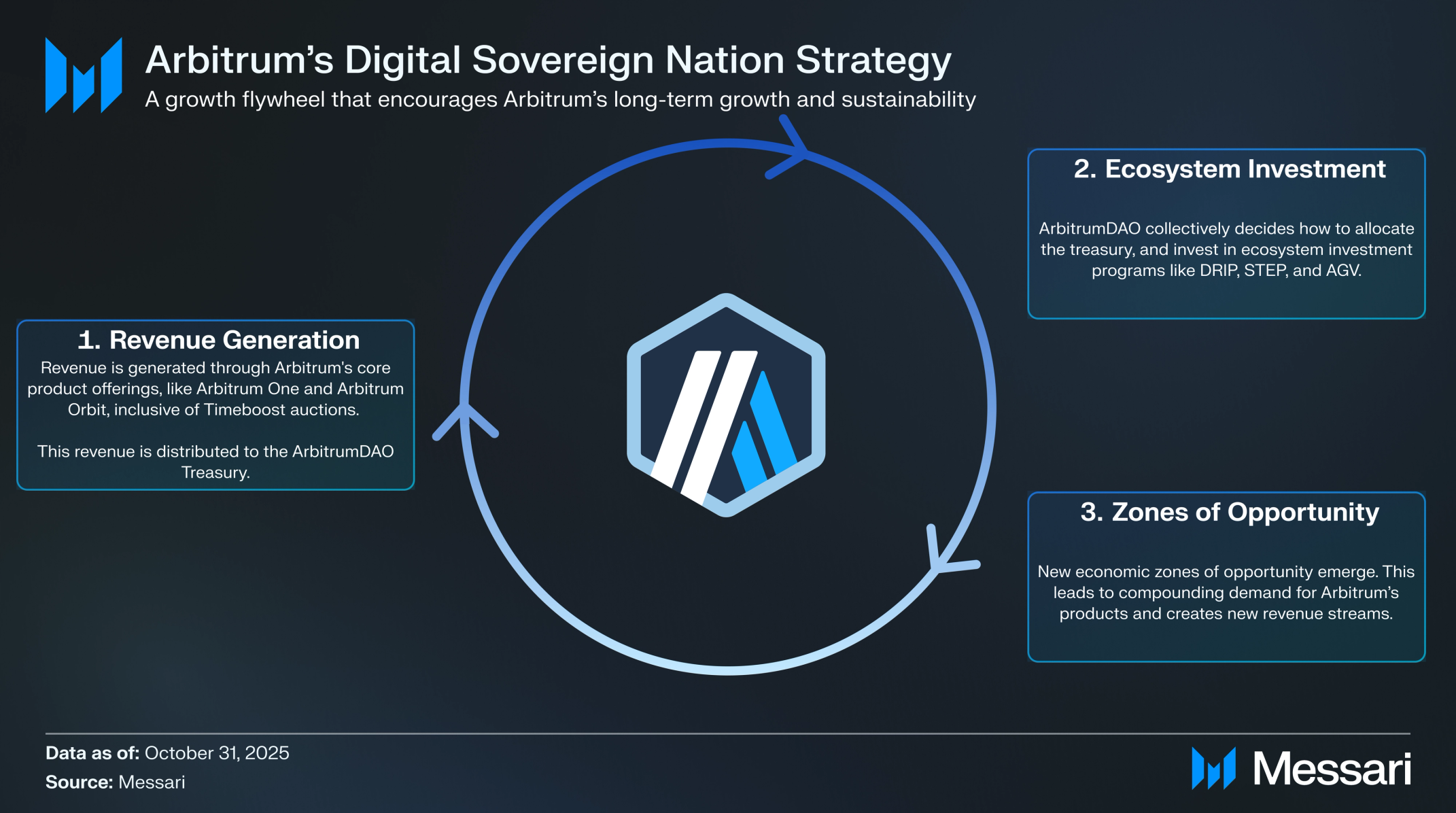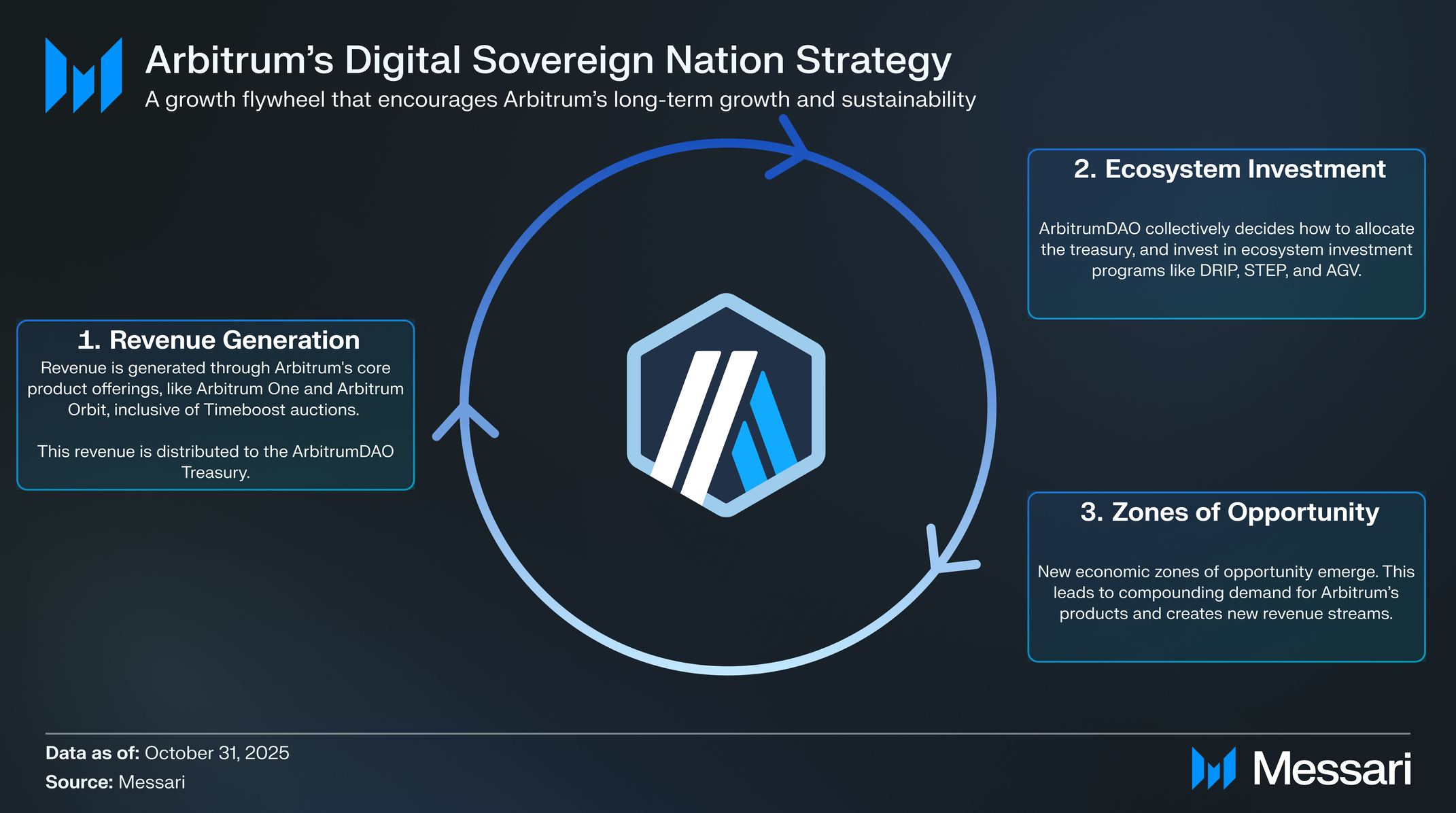 거버넌스 레이어에서, 아비트럼다오는 자립적인 디지털 주권 국가가 되기 위한 경로를 계속 이어간다. 다각화된 출처 세트에 걸쳐 프로토콜 수익을 포착함으로써, 아비트럼다오는 DRIP과 같은 생태계 투자 프로그램에 자금을 지원하고 STEP 및 AGV와 같은 이니셔티브를 통해 기회의 경제 구역을 육성한다. 이는 네트워크 성장, 빌더 성공, 이해관계자 가치를 일치시키는 자기 강화 경제 엔진을 만든다.