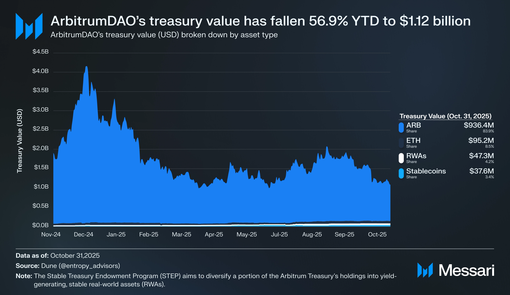 2025년 10월 31일 기준으로, 아비트럼다오 국고의 RWA 보유(USD)는 총 4730만 달러였다. 개시 이후, STEP은 총 이자 수익(USD) 140만 달러를 창출했다.