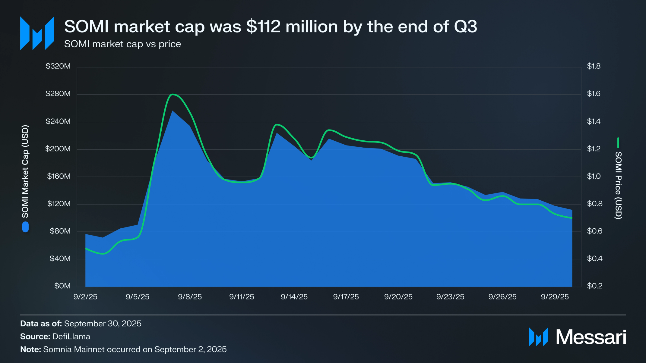2025년 3분기 말까지 SOMI의 총 시가총액은 1억 1,200만 달러였다. 토큰은 출시 후 일부 변동성을 경험하여 가격이 1.77달러의 정점까지 올랐다가 분기 말까지 0.70달러로 하락했다. 변동성은 에어드롭과 그에 따른 투자자 관심으로 인한 것으로 보이며, 이는 가격을 끌어올렸고 보유자들 사이에서 매도세로 이어졌다.