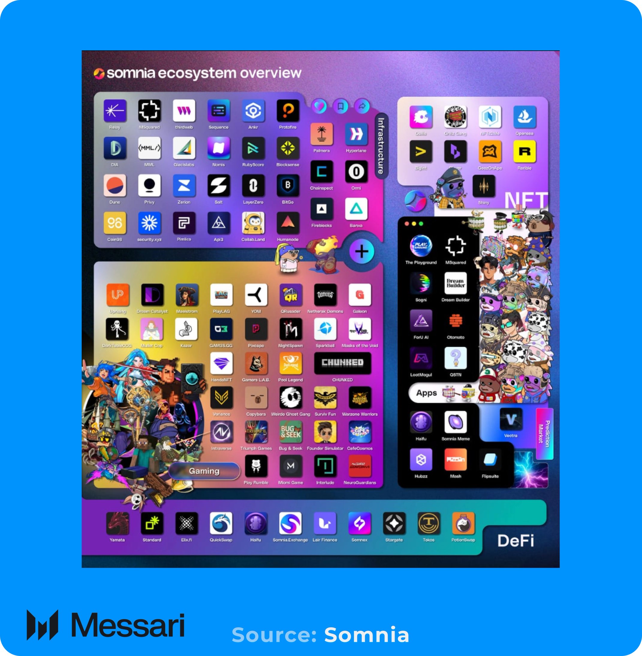 Somnia의 생태계는 상호운용성과 접근성을 중심으로 구축되었다. 네트워크는 Google Cloud, BitGo, Fireblocks, Banxa와 같은 인프라 파트너와 통합되며, LayerZero를 통해 외부 블록체인에 연결된다. Dune Analytics와의 파트너십은 데이터 가시성을 향상시키며, OpenSea 및 Rarible과의 통합은 NFT 유동성과 크리에이터 온보딩을 지원한다.