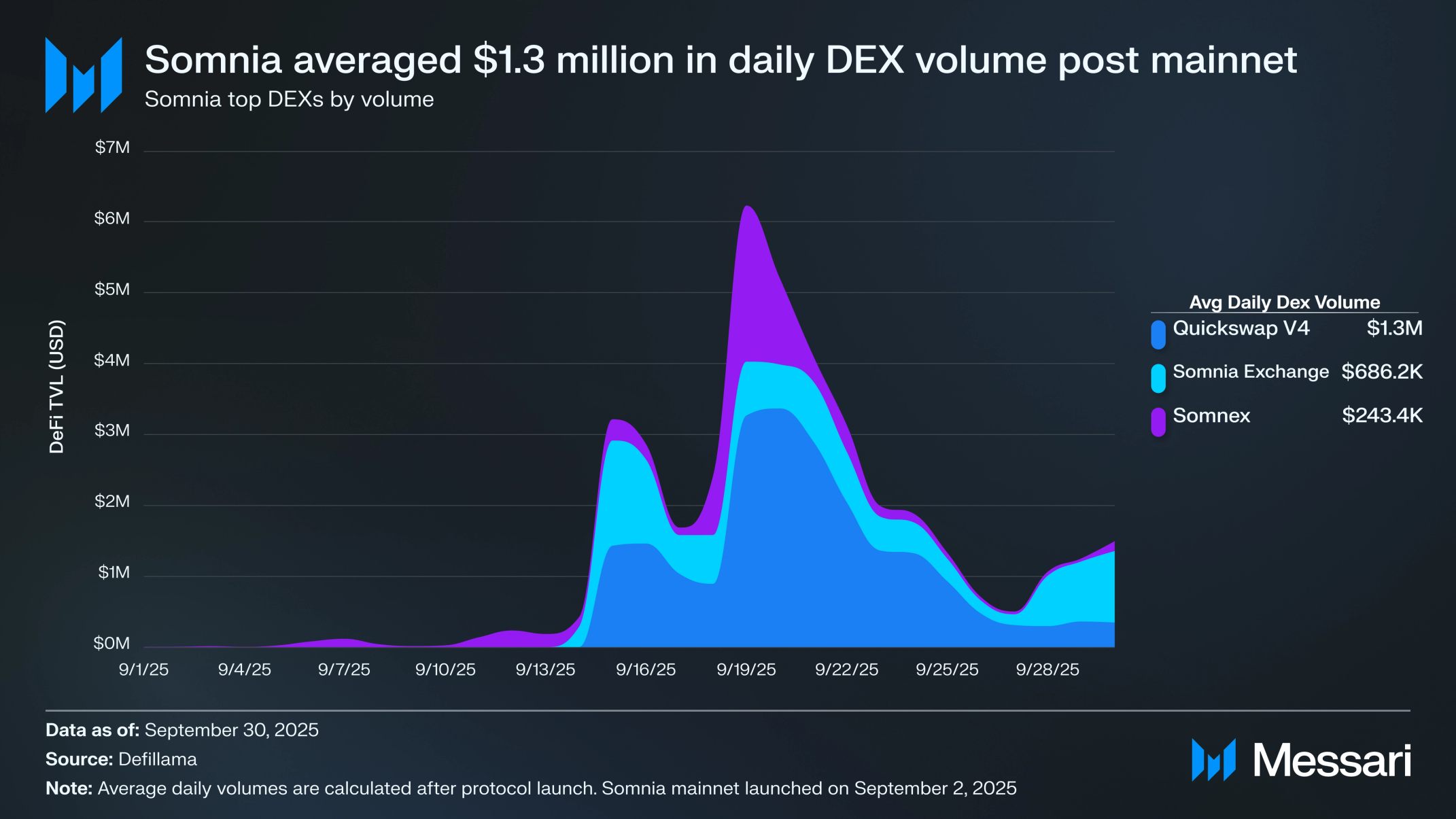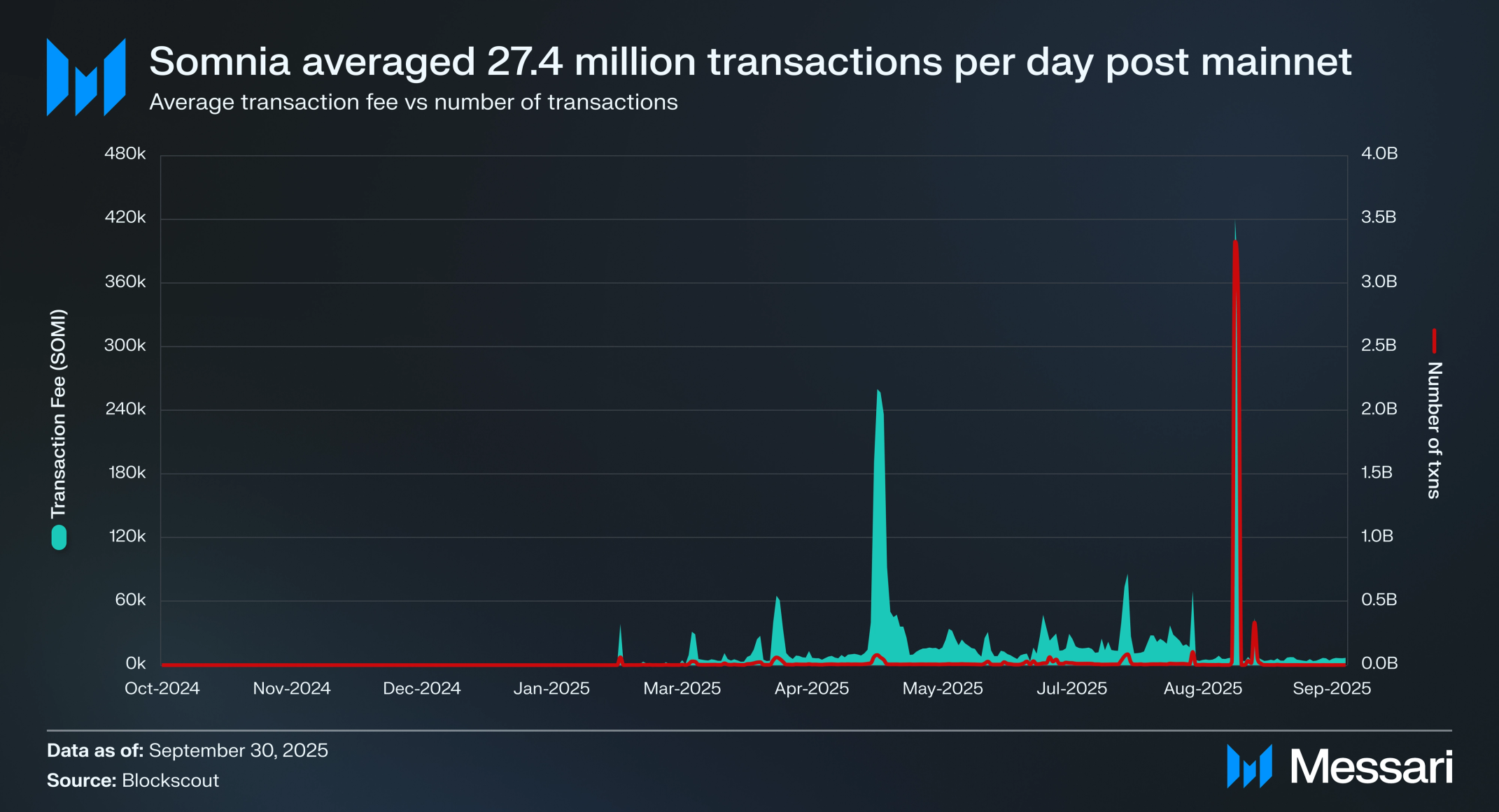 Somnia는 100억 건 이상의 거래를 처리하고 1억 1,800만 개의 고유 지갑을 온보딩한 6개월간의 테스트넷 단계에서 전환을 표시하는 9월 2일 메인넷 출시와 함께 2025년 3분기를 마감했다. SOMI는 1.77달러로 정점을 찍은 출시 후 변동성을 경험한 후 토큰당 0.70달러에 1억 1,200만 달러의 시가총액으로 분기를 마감했다. 메인넷 활성화 이후, 네트워크는 일평균 1,430만 건의 거래를 처리하고 9월 동안 19만 9,400 SOMI의 수수료를 생성했는데, 테스트넷 수준에서는 감소했지만 에어드롭 파밍을 넘어선 지속적인 유기적 활동을 나타냈다.