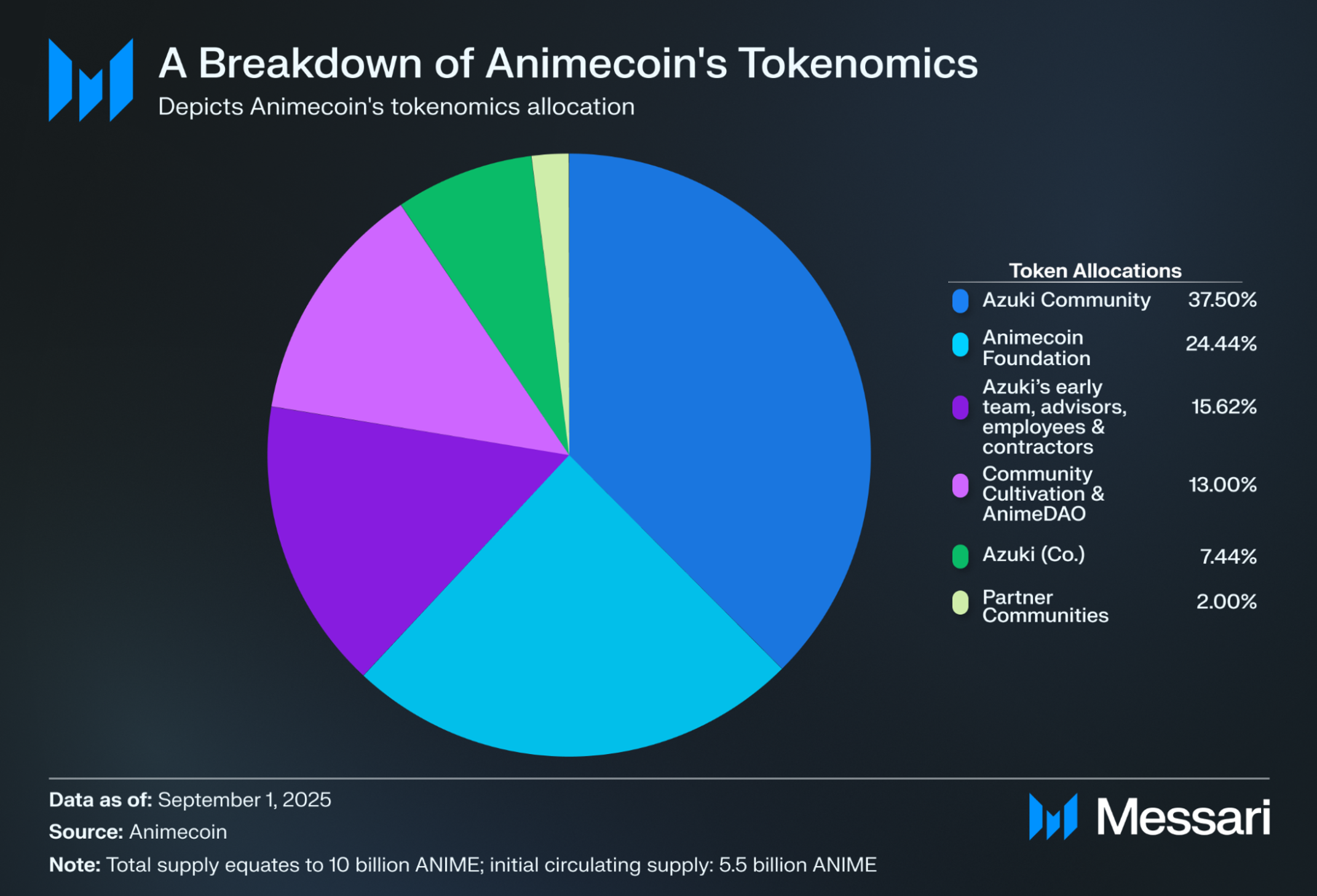 애니메코인은 100억 개의 ANIME 고정 공급량을 가지고 있으며, 초기 유통량은 55억 개의 ANIME이다. 배분은 다음과 같다: