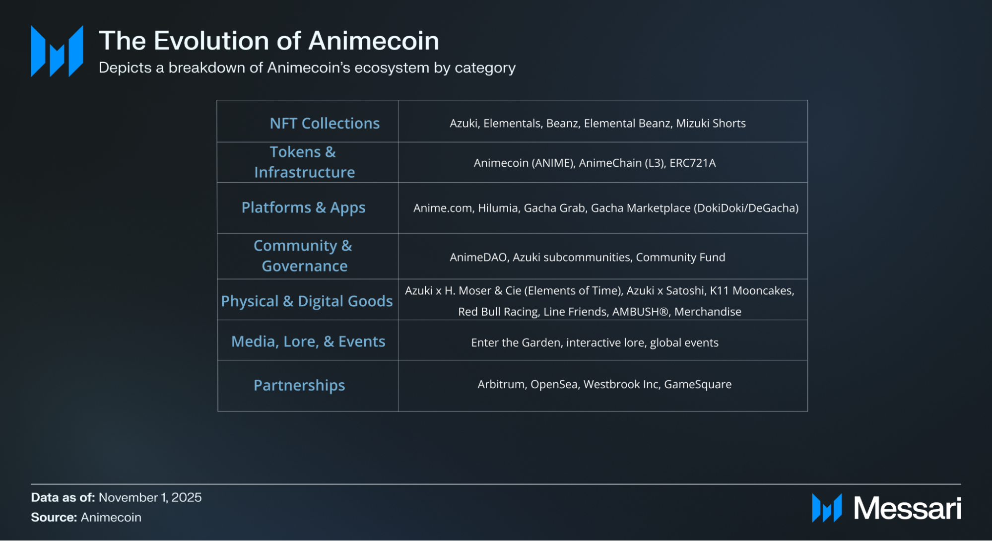 파트너십: 아비트럼, 오픈씨, 웨스트브룩 인크(Westbrook Inc., 배우 윌 스미스와 그의 아내 제이다 핀켓 스미스가 설립한 엔터테인먼트 VC)와의 전략적 협력은 암호화폐 네이티브 및 주류 엔터테인먼트 채널 전반에 걸쳐 애니메코인의 도달 범위를 확장한다. 중요하게도, 2025년 8월에 발표된 게임스퀘어와의 프로토콜 파트너십은 디지털 자산 재무(DAT) 공간에서 애니메코인 이니셔티브의 하이라이트로, 프로토콜을 e스포츠, 게임, 온체인 재무 관리의 교차점에 위치시킨다.