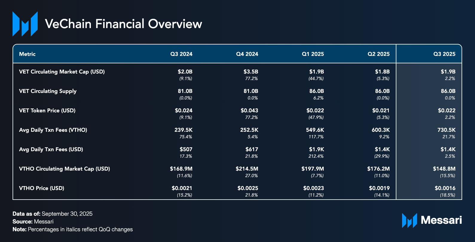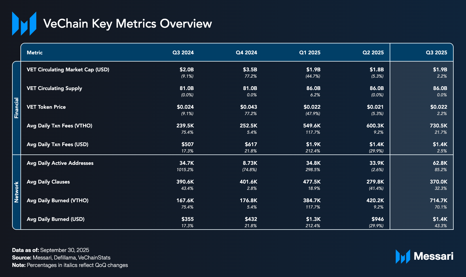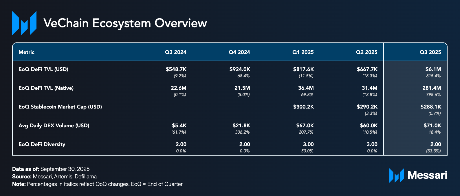 비체인은 프로토콜 펀더멘털과 생태계 개발 모두에서 측정 가능한 성과를 거두며 2025년 3분기를 마감했다. VET의 시가총액은 전분기 대비 2.2% 증가한 19억 달러를 기록했으며, VTHO의 시가총액은 가격 압박과 소폭의 인플레이션으로 인해 전분기 대비 15.5% 감소한 1억 4,880만 달러를 기록했다. 일평균 활성 주소는 전분기 대비 85.2% 증가한 62,800개를 기록했으며, 일평균 클로즈는 전분기 대비 32.3% 증가한 370,000개를 기록했다. DeFi 성과도 개선되었다. TVL은 전분기 대비 815.4% 증가한 610만 달러를 기록했으며, DEX 거래량은 전분기 대비 18.4% 증가하여 일일 71,000달러를 기록했다.