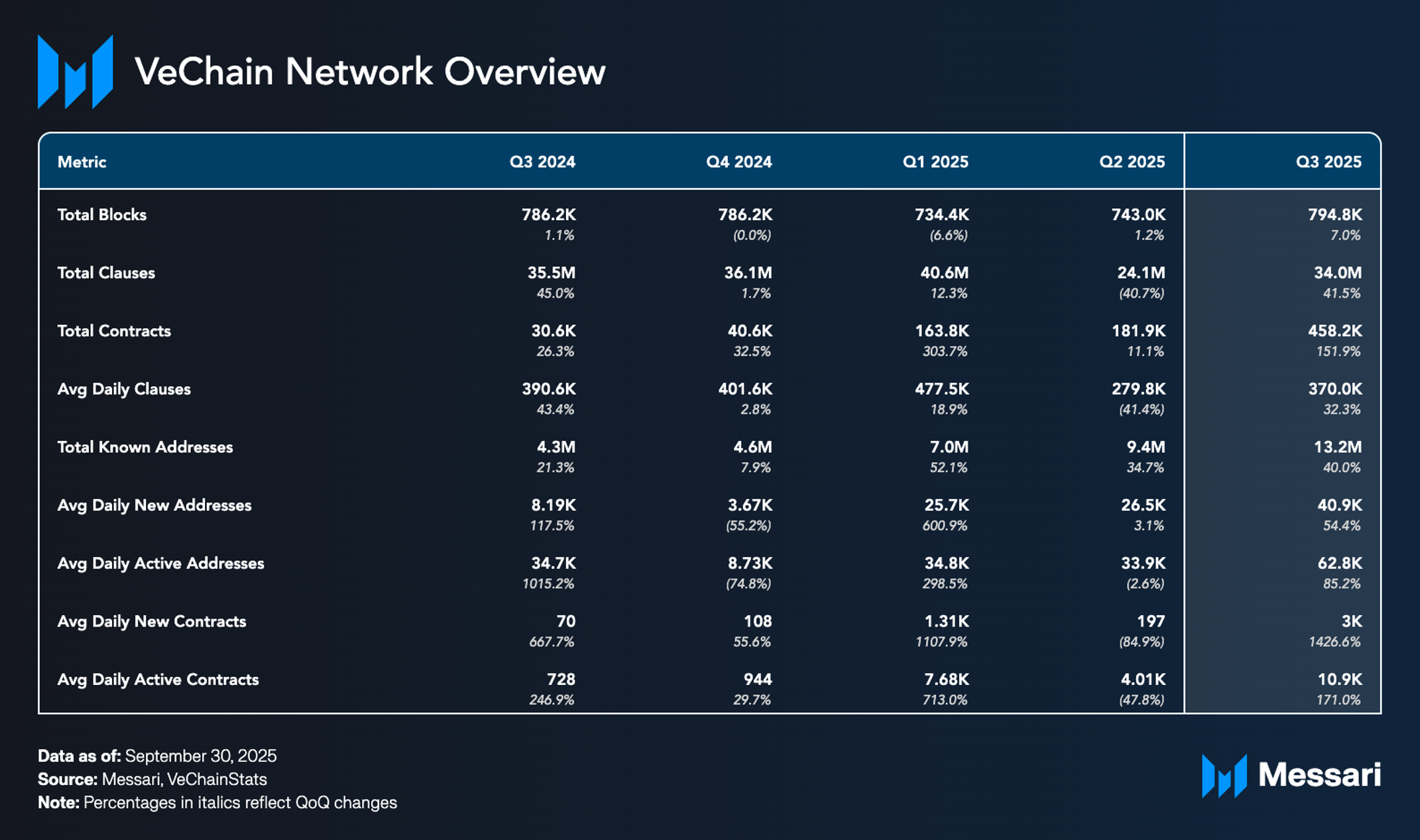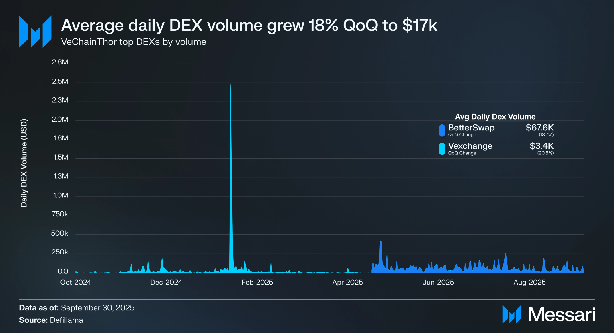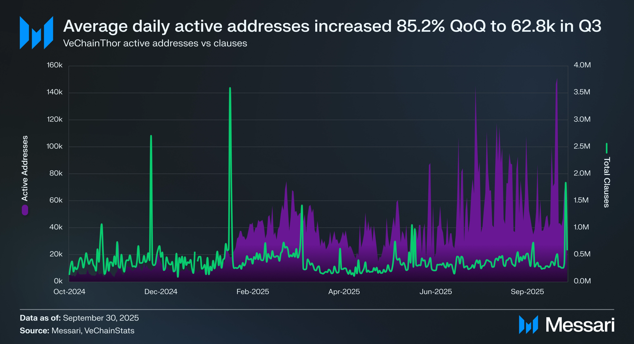 비체인은 프로토콜 펀더멘털과 생태계 개발 모두에서 측정 가능한 성과를 거두며 2025년 3분기를 마감했다. VET의 시가총액은 전분기 대비 2.2% 증가한 19억 달러를 기록했으며, VTHO의 시가총액은 가격 압박과 소폭의 인플레이션으로 인해 전분기 대비 15.5% 감소한 1억 4,880만 달러를 기록했다. 일평균 활성 주소는 전분기 대비 85.2% 증가한 62,800개를 기록했으며, 일평균 클로즈는 전분기 대비 32.3% 증가한 370,000개를 기록했다. DeFi 성과도 개선되었다. TVL은 전분기 대비 815.4% 증가한 610만 달러를 기록했으며, DEX 거래량은 전분기 대비 18.4% 증가하여 일일 71,000달러를 기록했다.