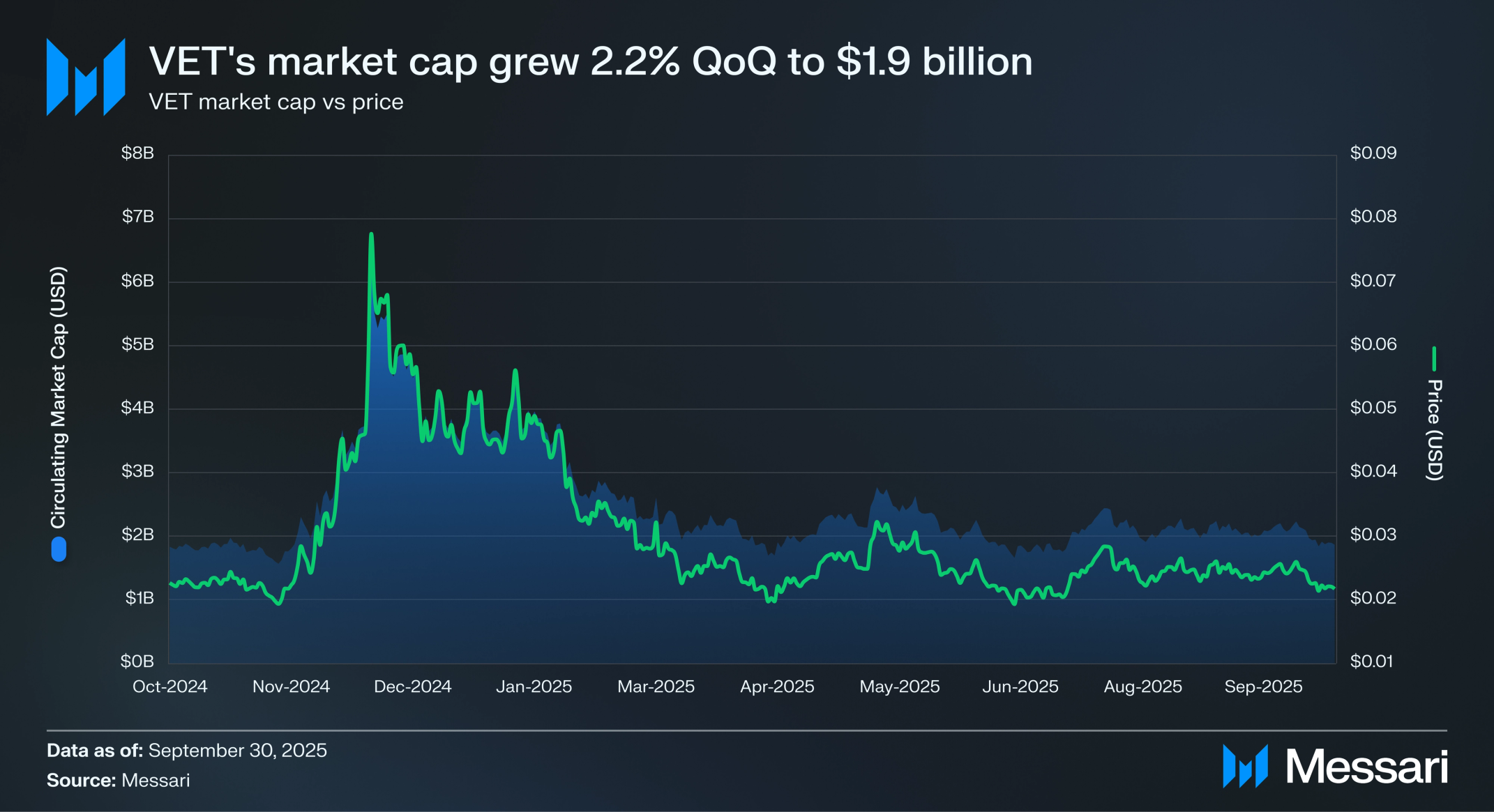 2025년 3분기에 VET의 총 시가총액은 전분기 대비 2.2% 증가한 19억 달러를 기록했다. 마찬가지로 VET의 가격은 2분기의 0.021달러에서 전분기 대비 2.2% 증가한 0.022달러로 분기를 마감했다. VET는 모든 다른 암호화폐와 비교하여 시가총액 기준 57번째로 큰 자산으로 분기를 마쳤다.