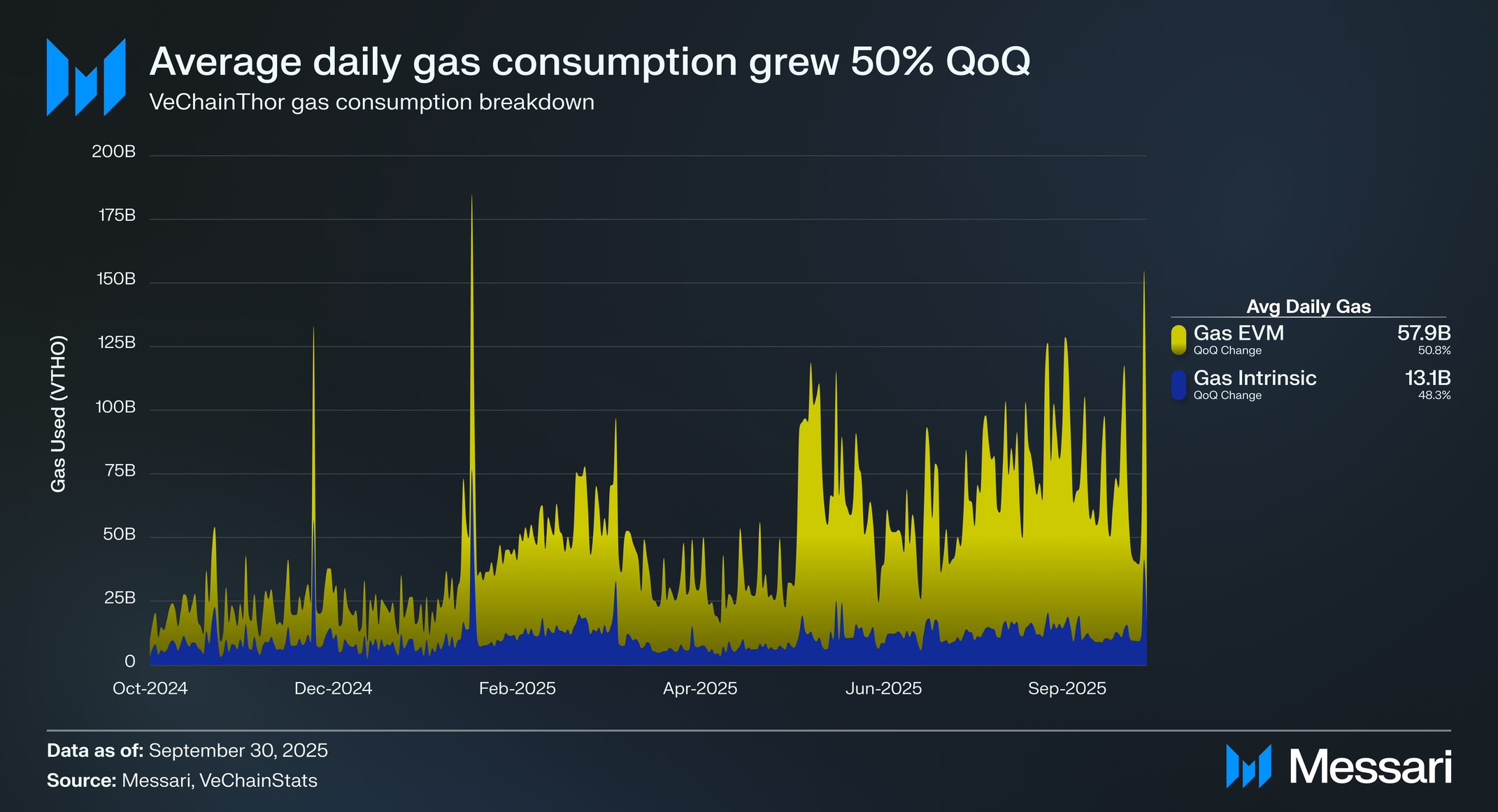 가스 사용량은 EVM 기반 트랜잭션이 계속 지배했으며, 총 가스 소비의 81.5%를 차지하여 일평균 579억 가스 단위를 기록했다. 이는 EVM 기반 가스 소비의 전분기 대비 50.8% 증가를 나타낸다. 더 단순한 트랜잭션 유형과 연결된 내재적 가스 사용량도 3분기에 증가하여 전분기 대비 48.3% 증가한 일평균 131억 가스 단위를 기록했으며, 전체 네트워크 활동의 18.5%를 차지했다.