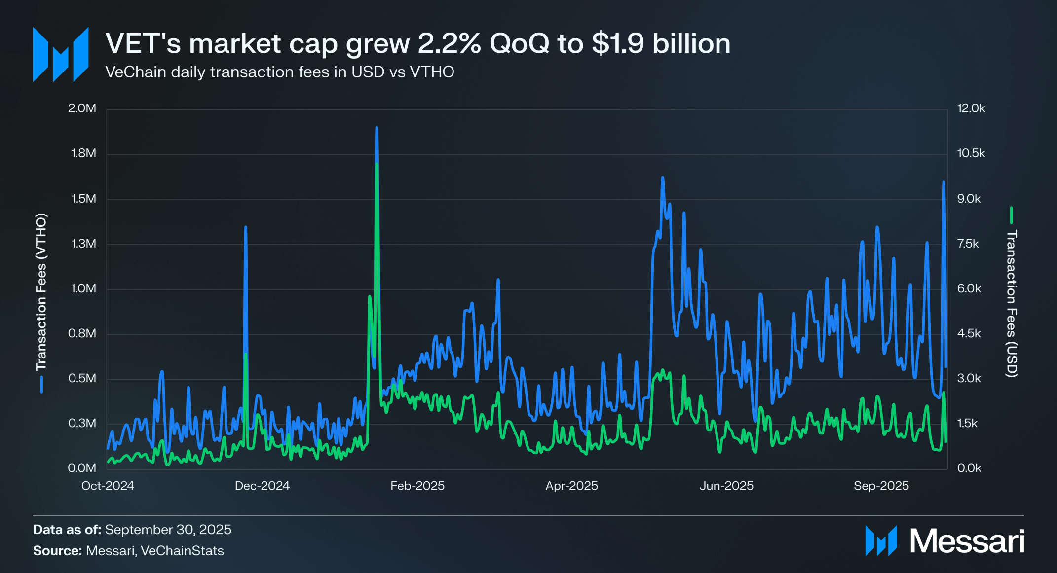 3분기에 비체인토르의 온체인 수수료 생성은 VTHO 기준으로는 소폭 증가했지만 USD 기준으로는 보합세를 유지했다. 일평균 트랜잭션 수수료는 약 730,500 VTHO로 전분기 대비 21.7% 증가했지만, 일일 약 1,400 USD로 안정세를 유지하여 전분기 대비 2.5% 상승에 그쳤다. 이러한 차이는 주로 VTHO의 가격 하락으로 인해 네트워크 활동의 성장이 상쇄되었기 때문이다.