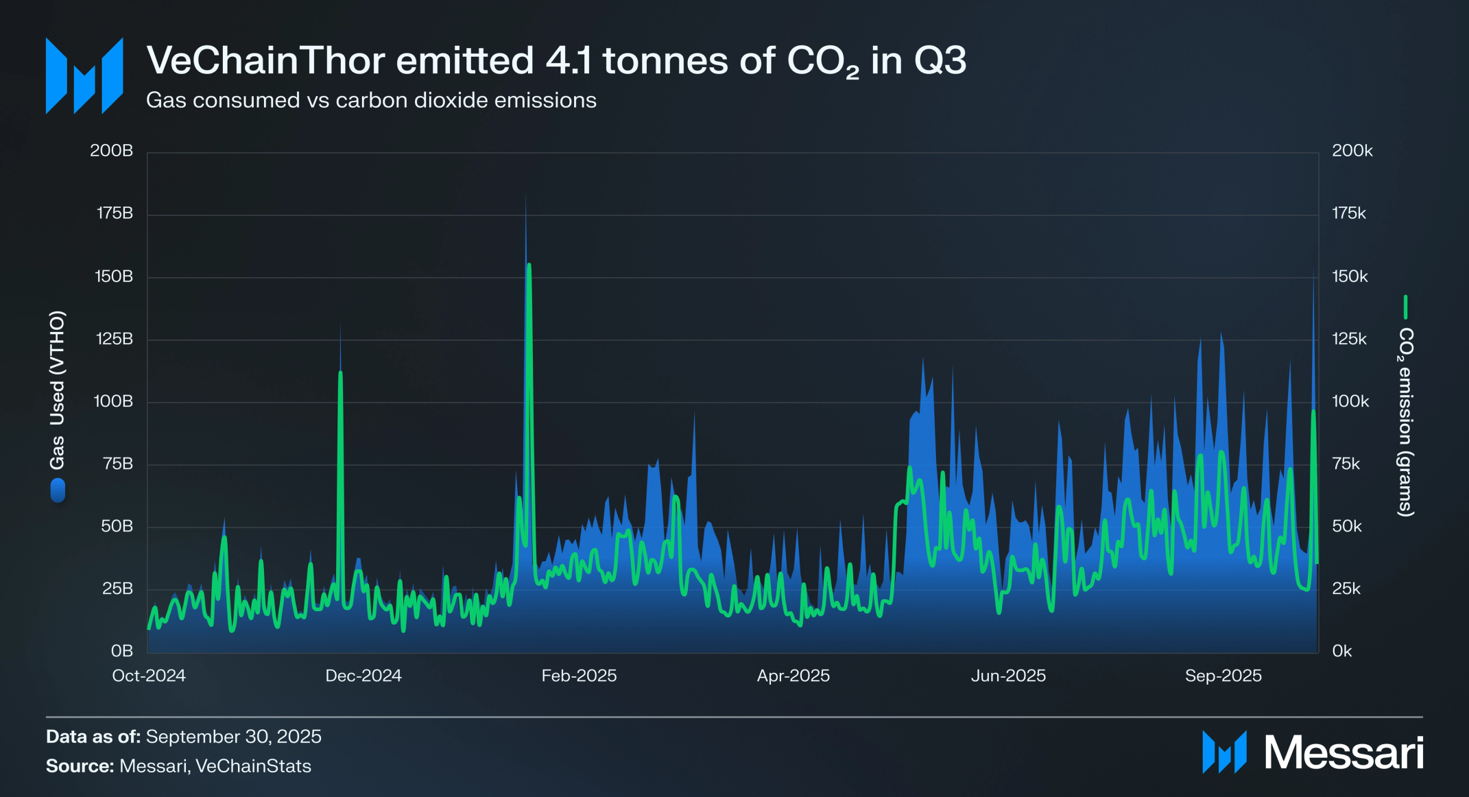 온체인 활동 증가로 인해 비체인토르의 CO₂ 배출량도 2025년 3분기에 증가했다. 네트워크는 분기 동안 약 4.1톤의 CO₂를 배출했으며, 이는 2분기 대비 57.7% 증가한 수치로 약 0.024에이커 숲의 연간 탄소 흡수량과 대략 동일하다.