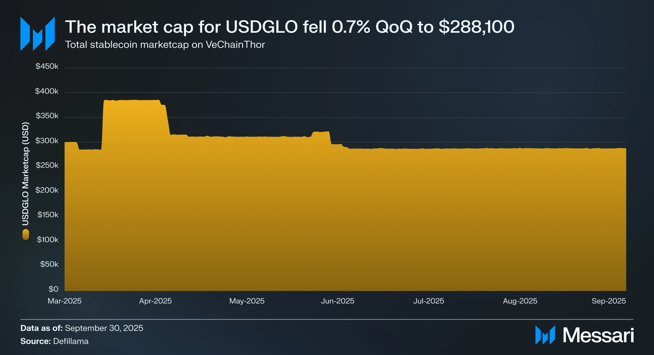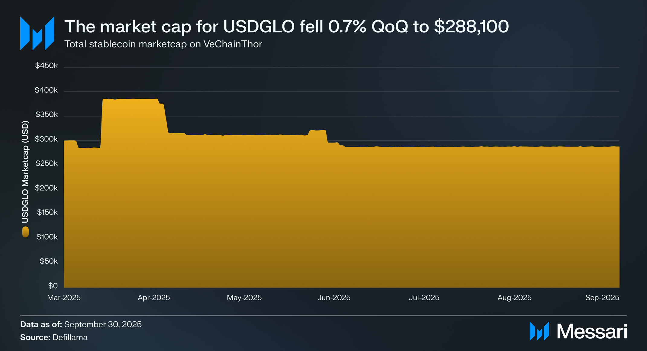 2025년 3월 18일, USDGLO가 비체인에서 출시되어 네트워크의 주요 스테이블코인으로 VeUSD를 대체했다. USDGLO의 도입은 네트워크의 금융 인프라 구축에 중요한 단계를 나타냈으며, DeFi 프로토콜, 거래 쌍, 소매 사용 사례를 위한 안정적인 결제 레이어를 제공했다. 변동성에 대한 노출을 줄임으로써 USDGLO와 같은 스테이블코인은 기업 채택과 소비자 대상 애플리케이션 모두를 지원할 수 있는 예측 가능한 교환 매체를 창출한다. 또한 USDLO 활동으로부터의 수익은 비체인 재단에 직접 전달되어 B3TR 토큰을 구매하는 데 사용될 것이다. USDGLO 수익을 통해 구매된 B3TR 토큰은 비베터에 제공되어 생태계 이니셔티브를 지원하고 생태계 참여에 인센티브를 제공하는 데 사용될 것이다. USDGLO는 3분기를 시가총액 28만 8,100달러로 마감했으며, 전분기 대비 0.7% 감소했다.