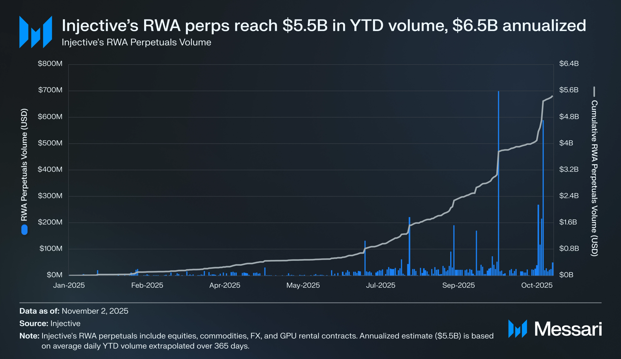 2025년 11월 2일 기준으로 인젝티브의 RWA 무기한 선물은 60억 달러의 누적 연초 대비(YTD) 거래량을 처리했다. 이는 8월 20일까지 기록된 16억 8,000만 달러에서 10주 동안 221% 증가를 반영하는 상당한 가속을 나타낸다. 연말까지 예상할 때, 인젝티브는 연간 환산 RWA 무기한 선물 거래량 65억 달러를 달성할 궤도에 있다.