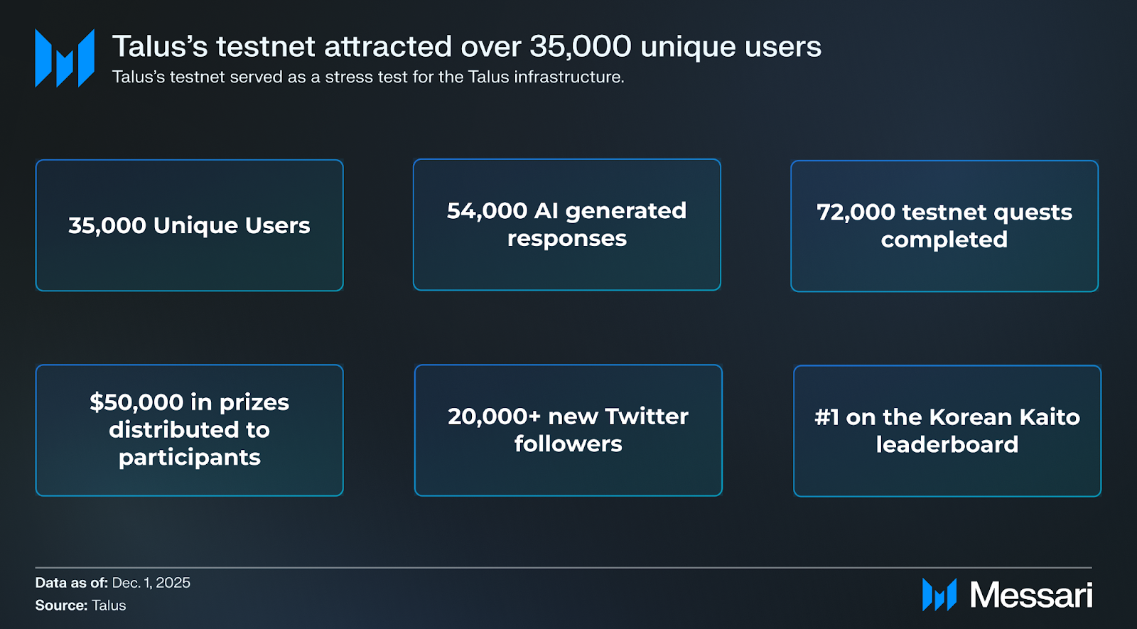 • 2025년 9월: 탈루스가 12만 5,000달러의 보상과 함께 테스트넷을 출시했으며, 아이돌닷펀도 출시하고 참여자에게 5만 달러의 보상을 제공했다.
