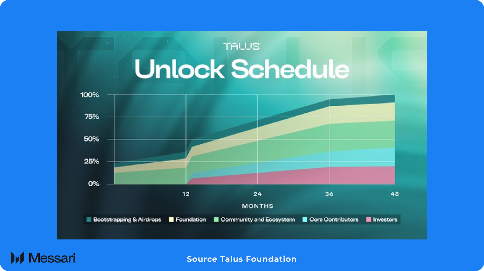 토큰의 20%는 글로벌 확장, 프로토콜 준비, 리더 네트워크 탈중앙화 인센티브와 관련된 노력을 위해 탈루스 재단에 할당된다. 소량이 1일차에 잠금 해제되며, 나머지는 36개월에 걸쳐 선형적으로 잠금 해제된다.