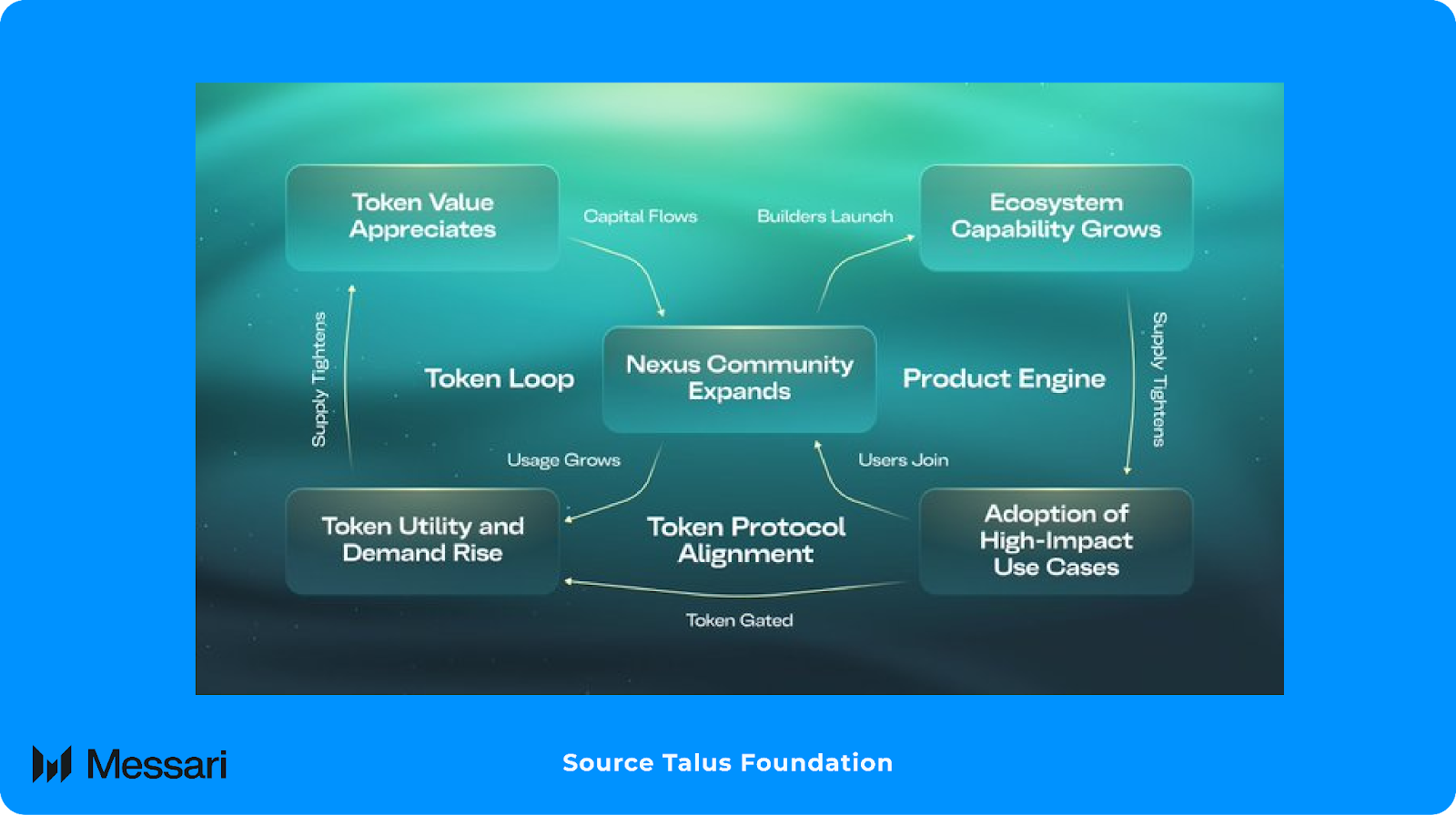탈루스는 일반화된 실행 및 조정 레이어를 인프라와 함께 제공하여 전체 디지털 경제의 기반 역할을 한다. 넥서스는 특정 사용 사례를 규정하지 않고 대신 모든 자동화된 워크플로우를 가능하게 한다. 이는 LLM 구동 데이터 처리부터 DeFi 전략 실행, 소비자 게임 로직에 이르기까지 다양할 수 있다. 넥서스는 도구, 에이전트, 에이전트 서비스를 사용 가능하고 유연하며 유능한 조합 가능한 프리미티브로 노출한다. 이러한 도구는 여러 에이전트와 서비스에서 재사용될 수 있으므로, 각 새로운 구성 요소는 선택성을 증가시키고 따라서 네트워크가 성숙해진다. 여기서 구축되고 있는 것은 클라우드 컴퓨팅의 아마존 웹 서비스(Amazon's Web Services), 모델 허브의 허깅 페이스(Hugging Face), 결제의 스트라이프(Stripe)에서 볼 수 있는 것과 유사한 네트워크 효과를 가질 수 있지만, 탈루스는 이를 탈중앙화된 에이전트 환경에서 수행하고 있다. 이는 차세대 인터넷 네이티브 자동화를 위한 인프라 기판이 된다.