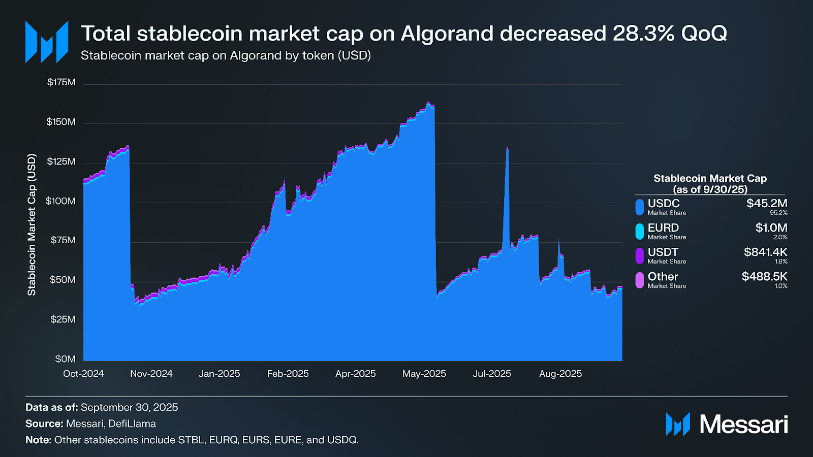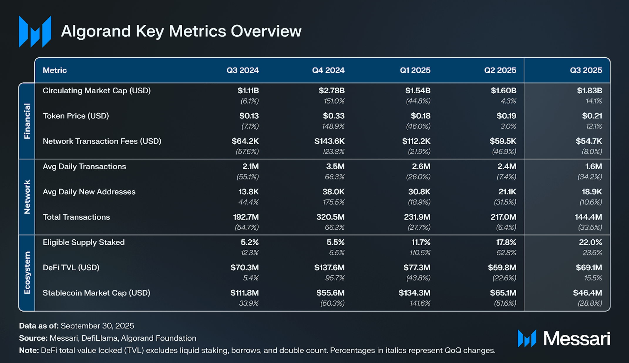 알고랜드는 더 큰 검증자 세트, 활성 온체인 거버넌스 시스템, DeFi 및 커뮤니티 스테이킹의 지속적인 성장과 함께 3분기를 마감했다. 이러한 추세는 시간이 지남에 따라 더 자립적인 생태계를 시사하며, 증가된 프로토콜 사용과 검증자 참여가 재단 주도 인센티브에 대한 의존도를 줄이고 있다.