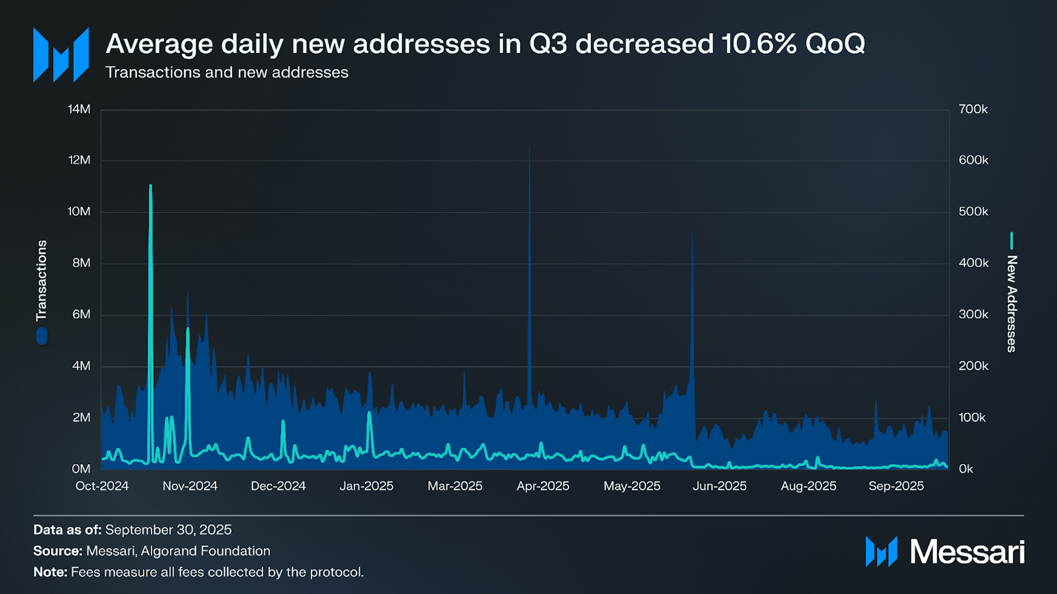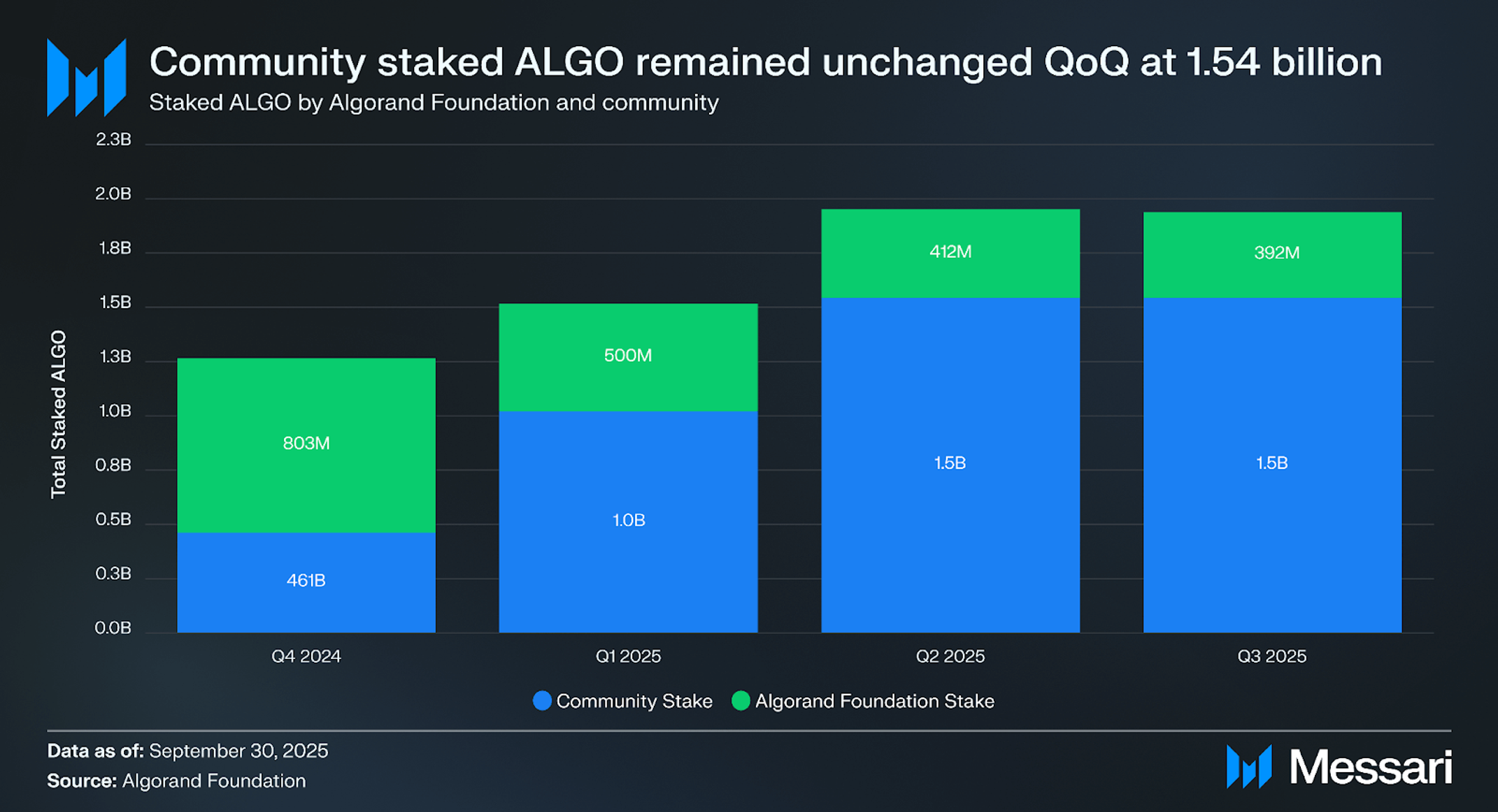 2025년 현재까지 커뮤니티 스테이킹 ALGO는 2024년 말 4억 6,100만 개에서 2025년 3분기 말 15억 4,000만 개로 234.7% 증가했다. 3분기에는 변동이 없었지만, 연초의 성장을 유지한 것은 알고랜드 스테이킹 시스템에 대한 지속적인 커뮤니티 참여를 보여준다.