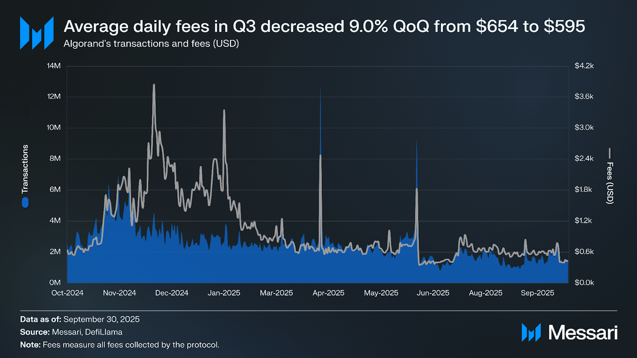 3분기에 일일 거래 건수는 최고 277만 건에서 최저 92만 4,200건까지 범위를 보였으며, 일일 수수료는 최고 932달러에서 최저 394달러까지 범위를 보였다. 3분기에는 이전 분기에 나타난 급격한 활동 급증이 부족했지만, 일관성은 네트워크 사용의 안정적인 기반을 나타낸다.