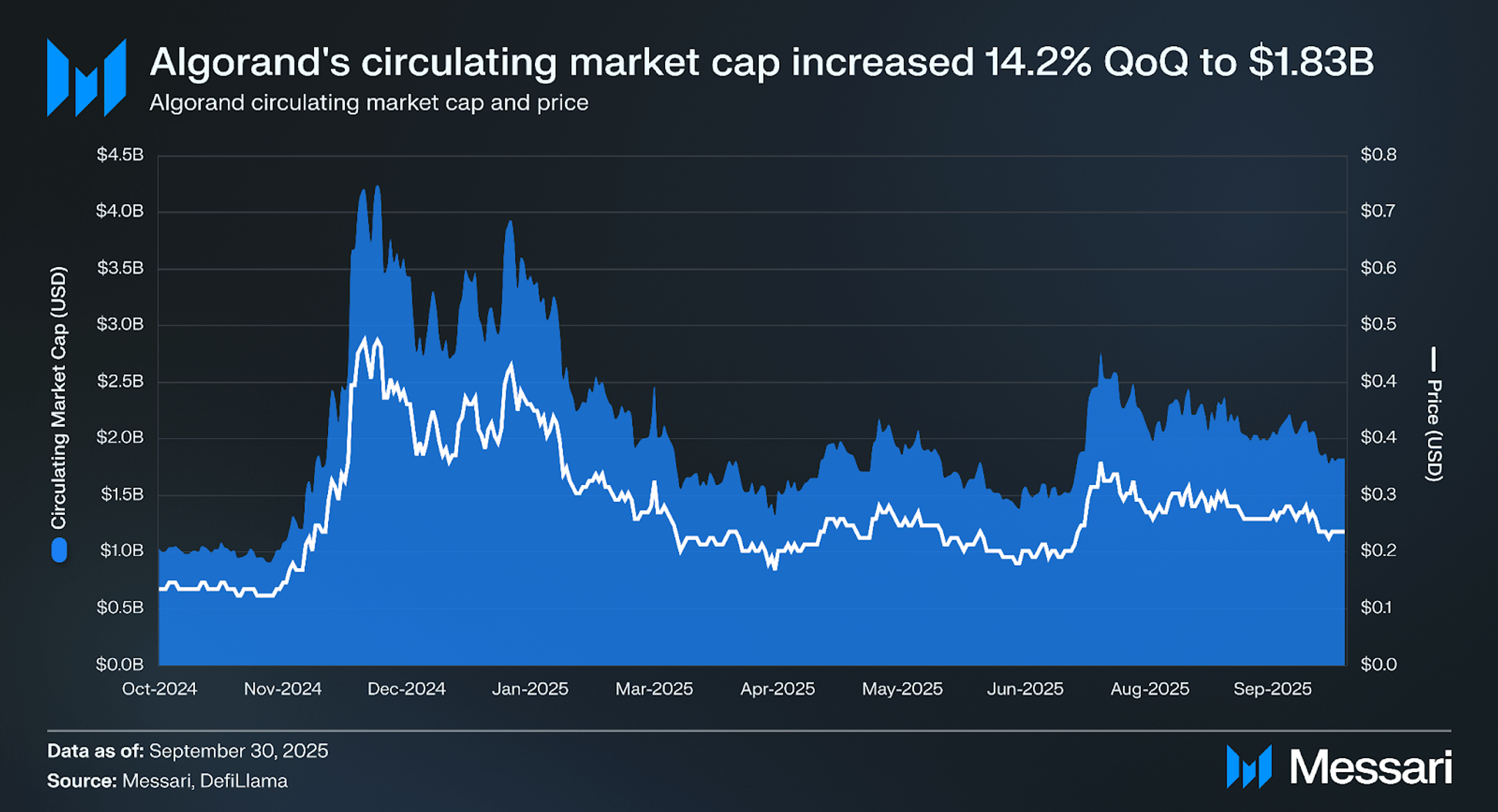 알고랜드의 유통 시가총액은 전분기 대비 14.2% 증가하여 2분기 말 16억 달러에서 3분기 말 18억 3,000만 달러를 기록했으며, 같은 기간 ALGO의 가격은 0.19달러에서 0.21달러로 전분기 대비 9.5% 상승했다. 이러한 차이는 유통 공급량이 86억 개에서 88억 ALGO로 1.7% 증가했기 때문이다.