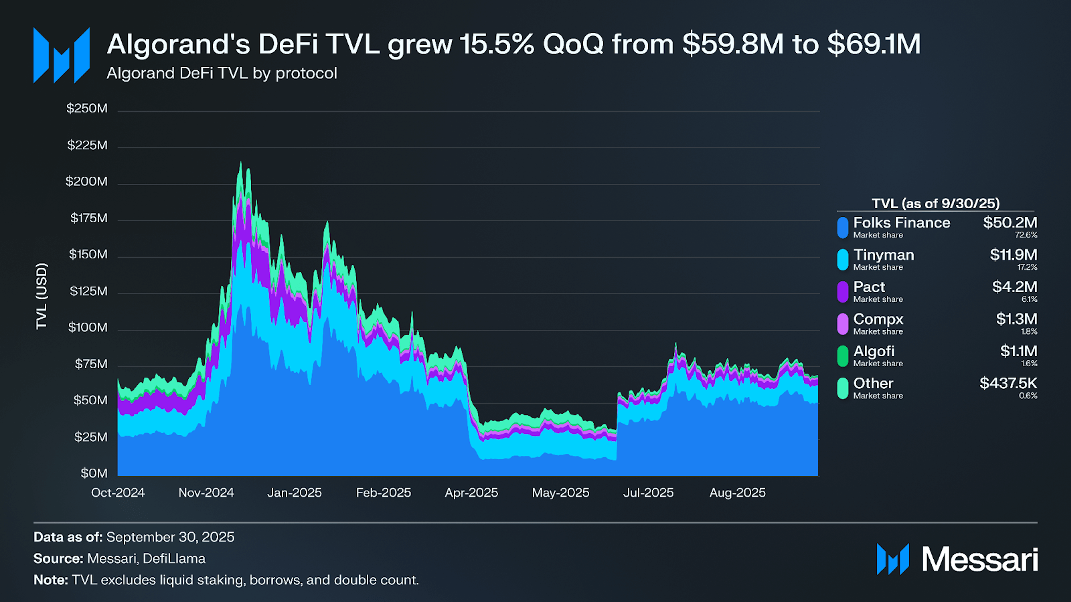 알고랜드의 DeFi TVL은 전분기 대비 15.5% 상승하여 5,980만 달러에서 6,910만 달러를 기록했다. 대출 프로토콜인 폭스 파이낸스는 전분기 대비 27.8% 성장하여 3,920만 달러에서 5,020만 달러를 기록했으며 3분기 말 DeFi TVL의 72.6% 시장 점유율을 차지했다. AMM DEX인 타이니맨(Tinyman)은 1,210만 달러에서 1,190만 달러로 1.9% 감소했지만 TVL 기준 알고랜드에서 가장 큰 DEX로 남았으며, 팩트(Pact)는 두 번째로 큰 DEX였고 전분기 대비 11.3% 성장하여 380만 달러에서 420만 달러를 기록했다. 수익 애그리게이터인 CompX는 전분기 대비 31.9% 감소하여 190만 달러에서 130만 달러를 기록했다.
