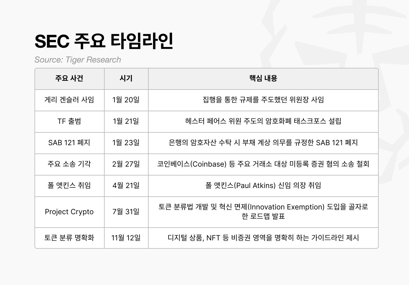 과거 SEC는 암호화폐와 관련되면 소송부터 걸었다. 리플, 코인베이스, 바이낸스, 크라켄 스테이킹 사건 등 주요 사례에서 SEC는 토큰의 법적 성격이나 허용 행위에 대한 명확한 기준을 제시하지 않은 채, 사후 해석을 근거로 집행에 나섰다. 그로 인해 암호화폐 기업 입장에서는 잠재적인 규제 리스크에 대비하는 것이 더 중요했다.
