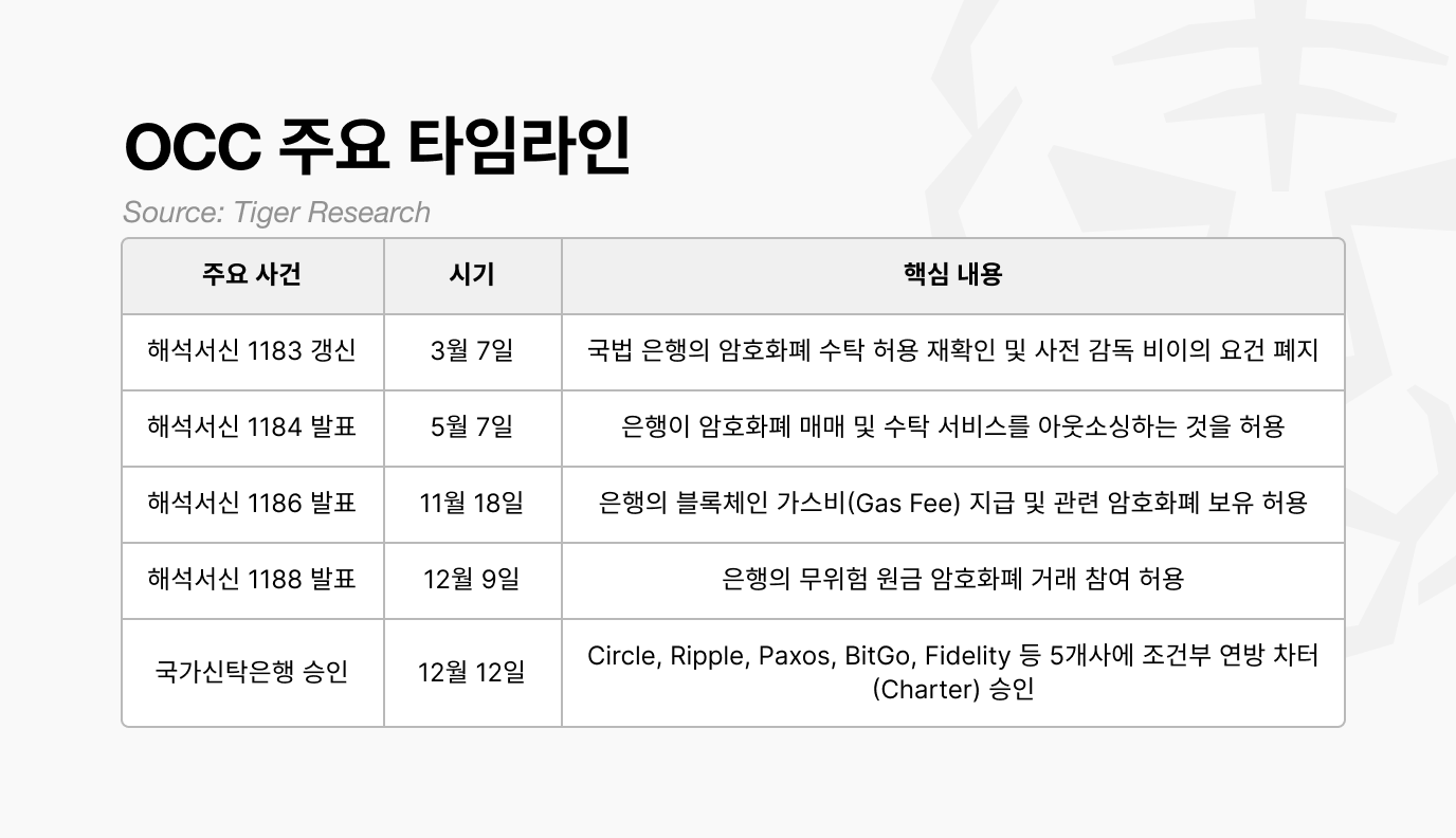 하지만 현재는 암호화폐 기업을 금융 시스템 밖에 두는 대신, 은행 규제 틀 안으로 끌어들이는 쪽을 택했다. OCC는 해석서신(감독기관이 특정 금융 활동의 허용 여부를 공식 문서로 밝히는 것)을 잇따라 발표했다. 은행의 암호화폐 보관, 거래, 가스비 지급까지 허용 범위를 점차 넓혀갔다. 이런 흐름의 정점은 12월에 나왔다. OCC는 써클, 리플 등 주요 기업에 국가 신탁은행 지위를 조건부로 승인했다.