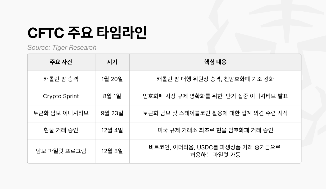 대표적인 예시로 ‘디지털 자산 담보 파일럿 프로그램’을 통해 비트코인, 이더리움, USDC를 파생상품 거래의 증거금으로 인정했고, 헤어컷과 리스크 관리 기준을 적용해 제도권 자산과 동일한 방식으로 관리하기 시작했다.