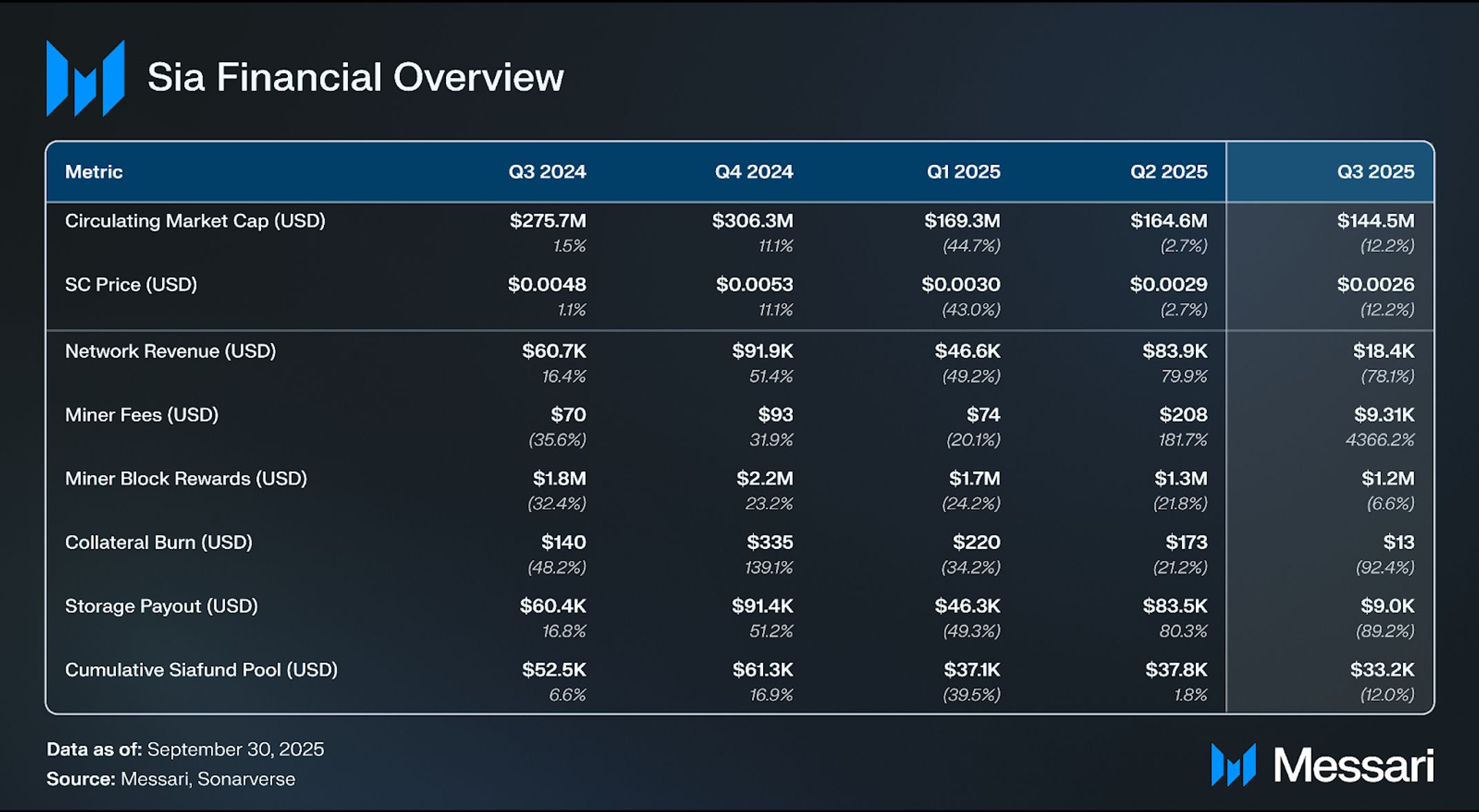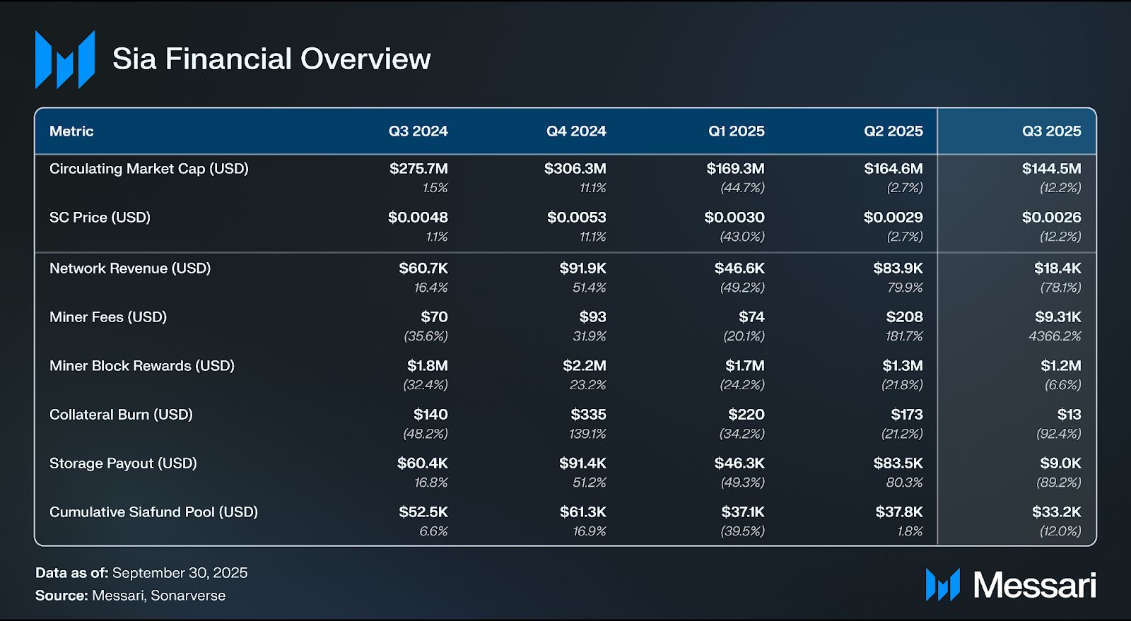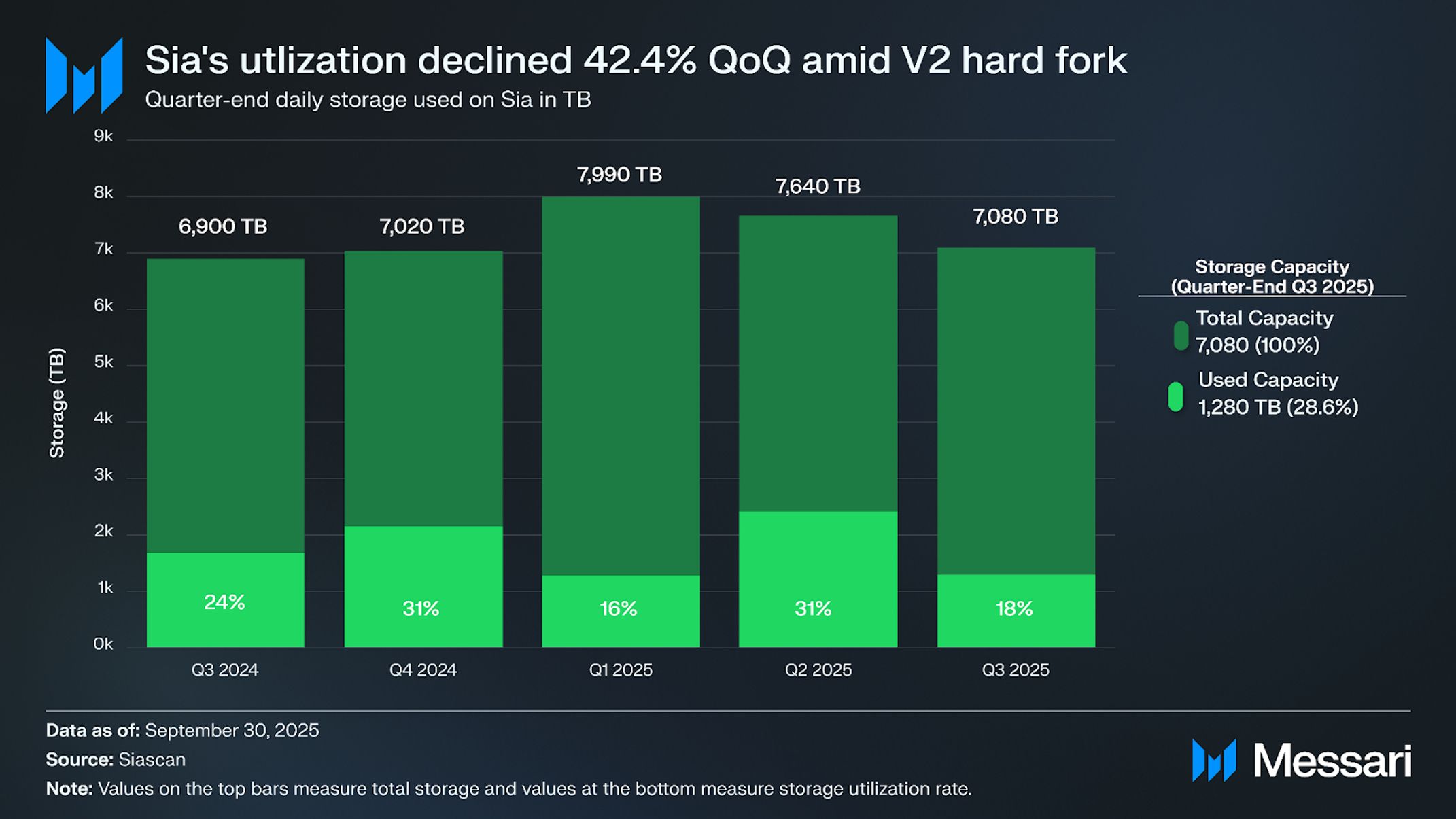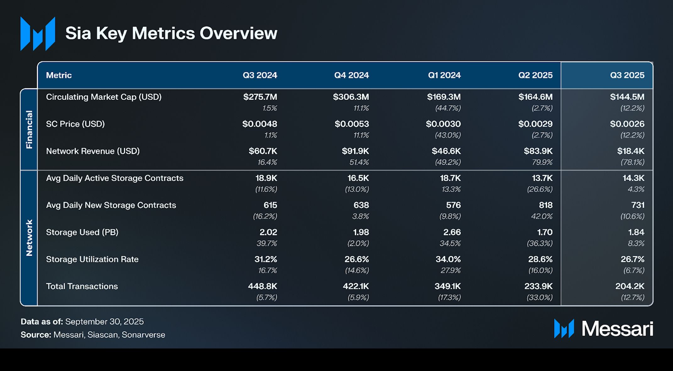 시아의 2025년 3분기는 마이그레이션 주도 재설정을 반영했다. 네트워크 활동은 완화되었으며 일일 거래는 2,220건, 신규 계약은 730건으로 감소하여 2분기의 둔화세를 연장했다. 활성 계약은 여전히 4.3% 증가한 14,300건을 기록했지만, 업그레이드 이후 레거시 계약이 만료되면서 사용률이 하락하여 사용 스토리지는 1,280 TB로, 사용률은 18.1%로 떨어졌다. 수익은 계약 전환이 수수료 지불 거래를 집중시키고 스토리지 지급을 주기 후반으로 밀어넣으면서 78.1% 감소한 18,390 달러를 기록했다.