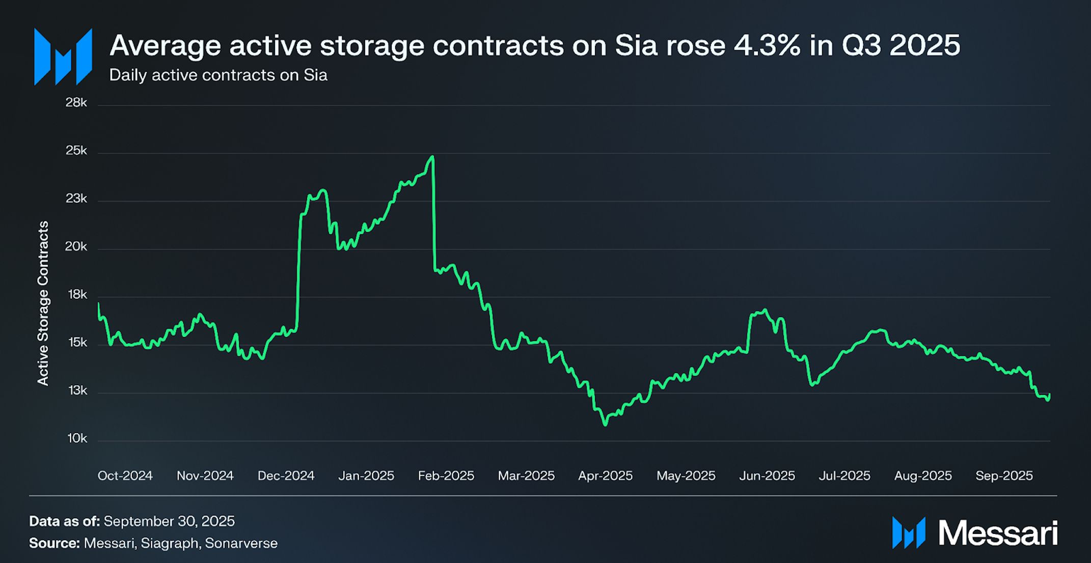 시아의 일평균 활성 스토리지 계약 수는 2025년 3분기에 14,300건으로 증가했으며, 2025년 2분기의 13,710건에서 전분기 대비 4.3% 증가했다. 신규 계약 수는 감소했지만 활성 계약의 증가는 신규 수요에 비해 계약 수명이 길어지고 이탈률이 낮아졌음을 시사한다. 활동은 분기 대부분 동안 낮은 추세를 보였지만, 2025년 7월 V2 하드포크의 성공적인 완료는 향후 안정화를 위한 기반을 제공했다. 전환 기간 동안 신규 사용자 참여가 감소했지만, 업그레이드의 확장성 및 사용성 개선은 후속 분기에 더 강력한 계약 유지 및 갱신을 위한 네트워크 포지셔닝을 제공한다.