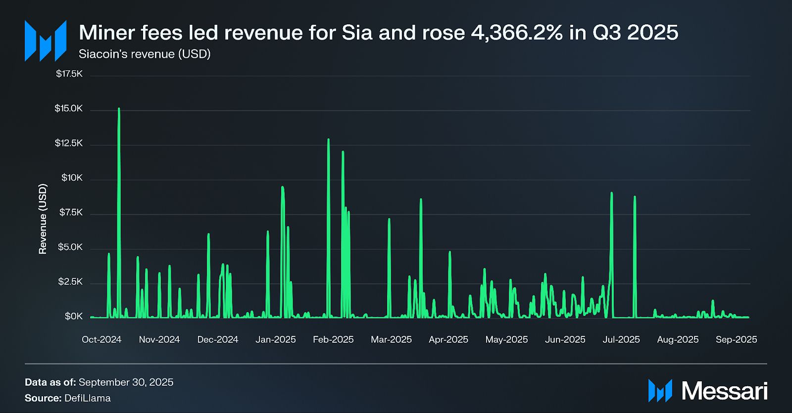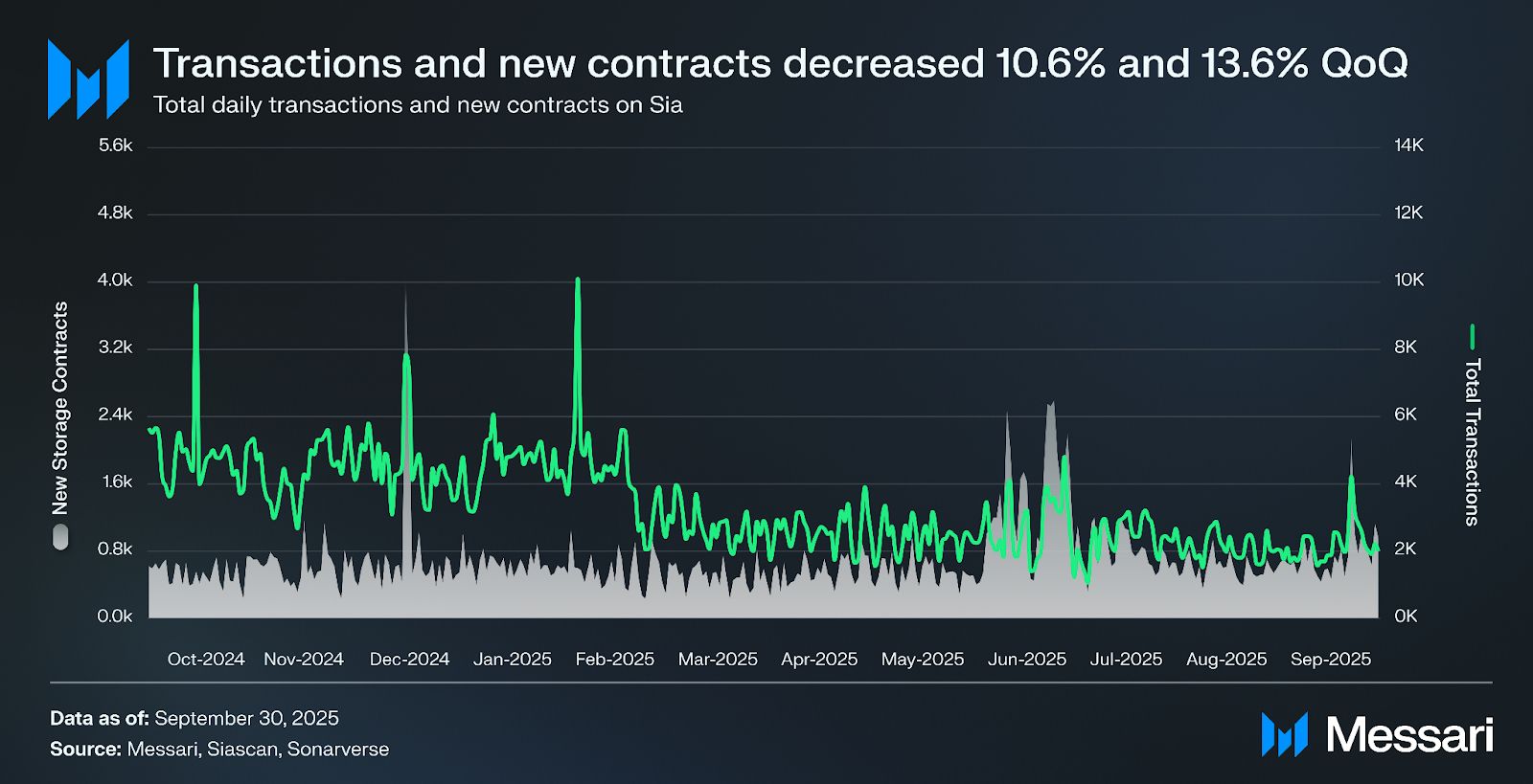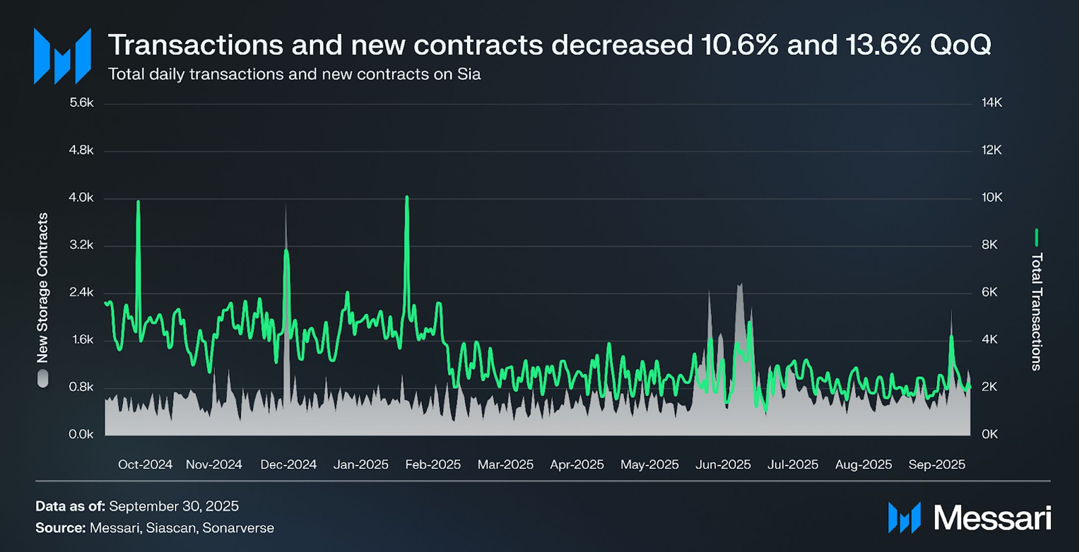 시아의 네트워크 활동은 2025년 3분기에 감소했으며, 2025년 2월 초반에 시작된 둔화세를 연장했다. 일일 거래는 분기 동안 평균 2,220건을 기록했으며, 2025년 2분기의 2,570건에서 전분기 대비 13.6% 감소했다. 신규 스토리지 계약 생성도 하락하여 일평균 731건을 기록했으며, 818건에서 전분기 대비 10.6% 감소했다.
