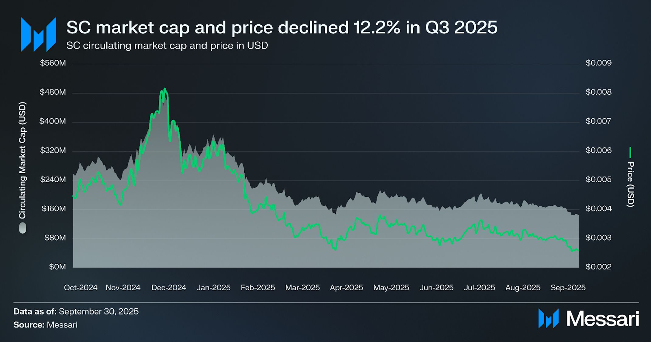 SC의 가격은 2025년 2분기에 0.0029 달러에서 0.0026 달러로 전분기 대비 12.2% 하락했다. 토큰 언락이나 베스팅 스케줄이 아닌 지속적인 채굴을 통해 생성되는 유통 공급량은 미미하게만 증가하여 유통 시가총액(USD)도 1억 6,460만 달러에서 1억 4,450만 달러로 12.2% 감소했다. 결과적으로 SC의 시가총액 순위는 234위에서 285위로 하락했다.