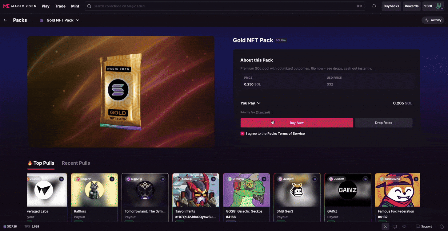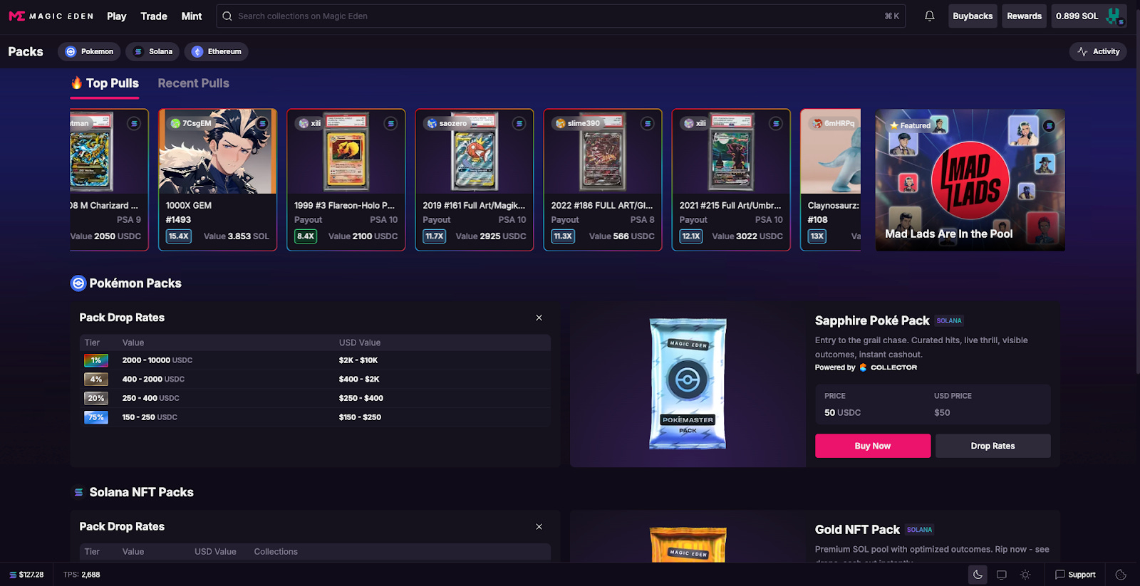 2025년 10월 말에 출시된 ‘팩(Packs)’은 매직에덴의 기존 전략을 한 단계 확장한 서비스다. 이 서비스는 실제 종이 카드 팩을 손으로 직접 뜯을 때 느끼는 설렘을 디지털 세상으로 옮겨왔다. 이용자는 앱 내 활동을 통해 얻은 디지털 팩을 뜯어서 희귀한 수집품을 찾을 수 있다. 수집품의 종류는 솔라나와 이더리움 기반의 유명 NFT부터 포켓몬 카드까지 매우 다양하다.