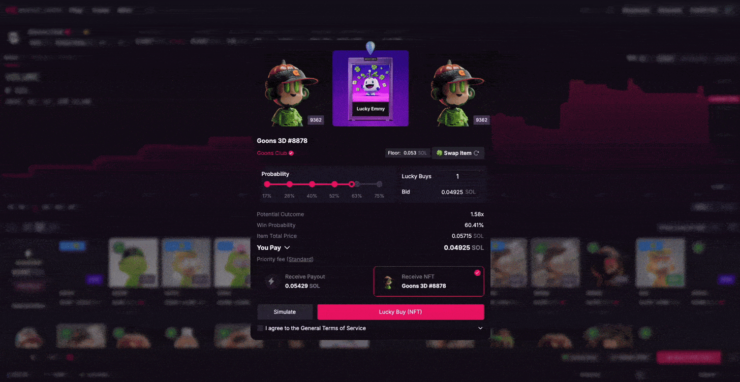 매직에덴의 엔터테인먼트 전략을 보여주는 가장 대표적인 사례는 2023년 9월에 출시된 ‘럭키 바이’다. 사용자는 고가의 NFT를 정가에 모두 지불하는 부담 없이, 적은 금액만 걸고 룰렛을 돌려 해당 NFT를 획득할 기회를 얻는다.