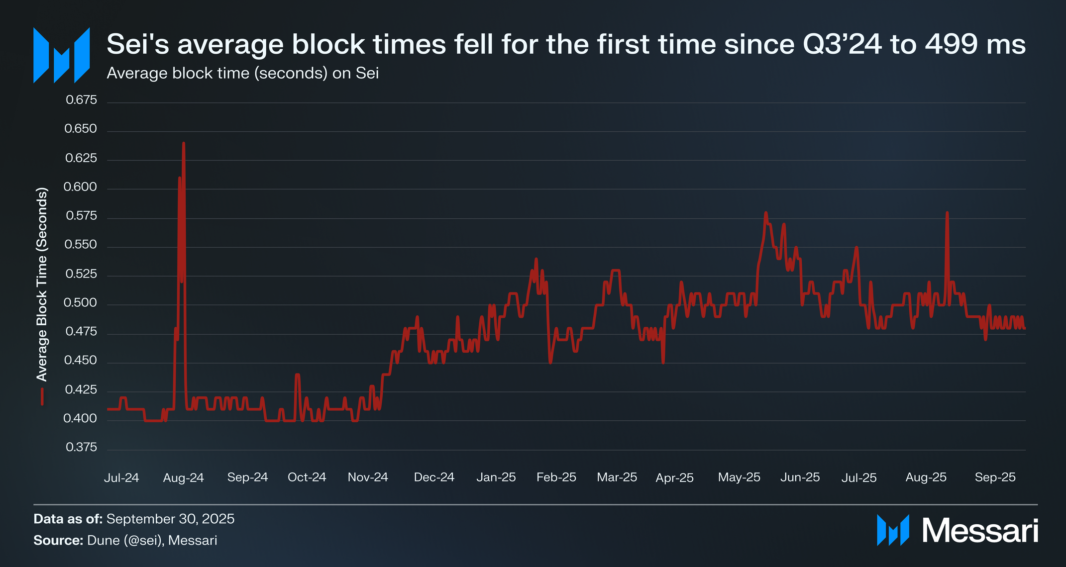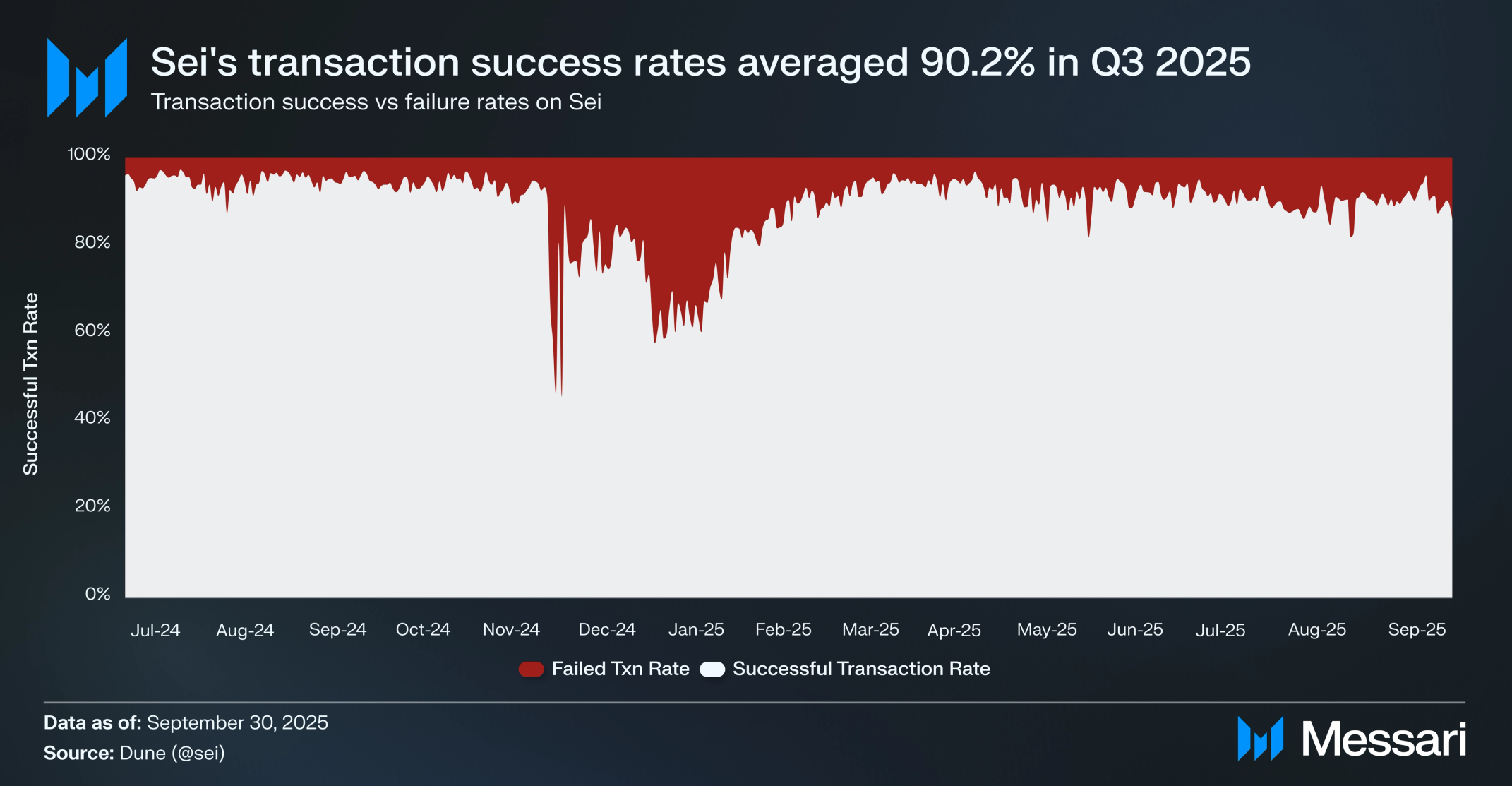 세이의 거래 실패율은 2024년 12월과 2025년 1월에 각각 22.7%와 29.7%로 급증했다. 실패율은 그 기간 이후 정상화되기 시작했으며, 2월에는 12.5%, 3월에는 6.4%로 떨어졌고, 2025년 2분기 내내 평균 7.7%, 2025년 3분기에는 9.8%를 기록했다. 한편, 세이의 평균 블록 시간은 감소하여 2025년 2분기 평균 513밀리초에서 2025년 3분기 499밀리초로 전분기 대비 2.7% 감소했다.