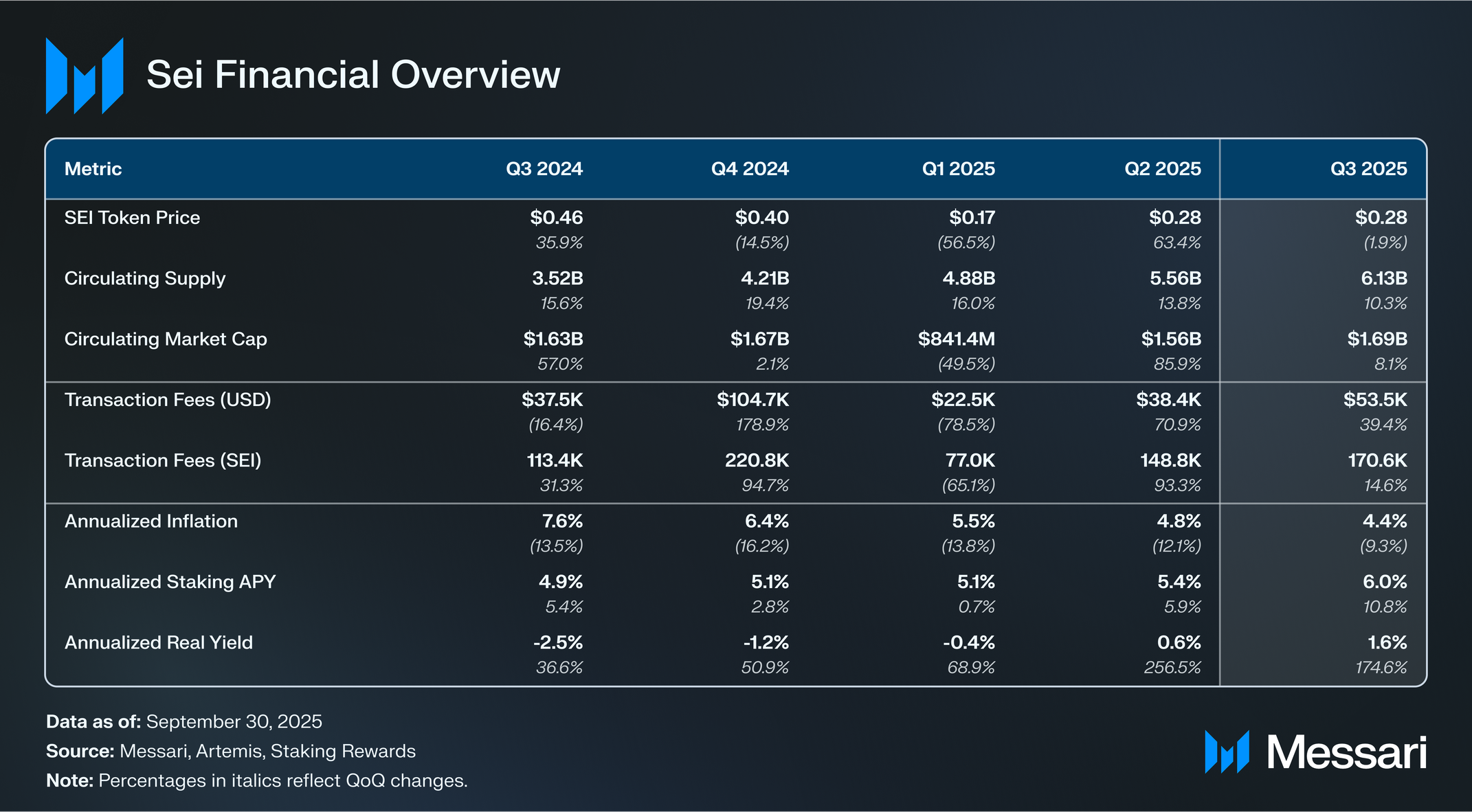 연간 인플레이션은 2025년 3분기에 4.8%에서 4.4%로 감소했다. 스테이킹된 SEI의 양이 전분기 대비 10.3% 감소한 것과 결합하여, 연간 스테이킹 APY는 5.4%에서 6.0%로 증가했다. 이로 인해 SEI 스테이커들이 긍정적인 연간 실질 수익률을 경험한 두 번째 분기가 되었으며, 이번 분기의 연간 실질 수익률은 1.6%였다.