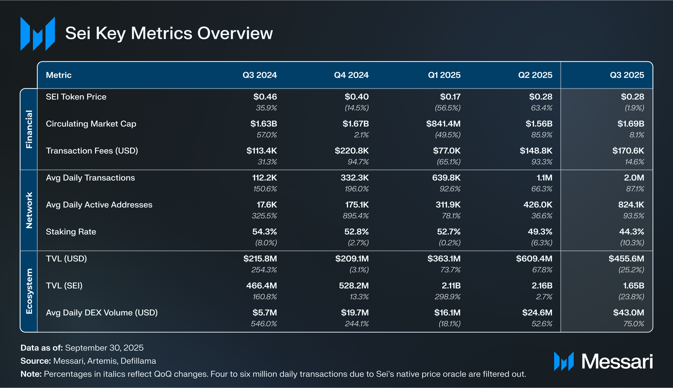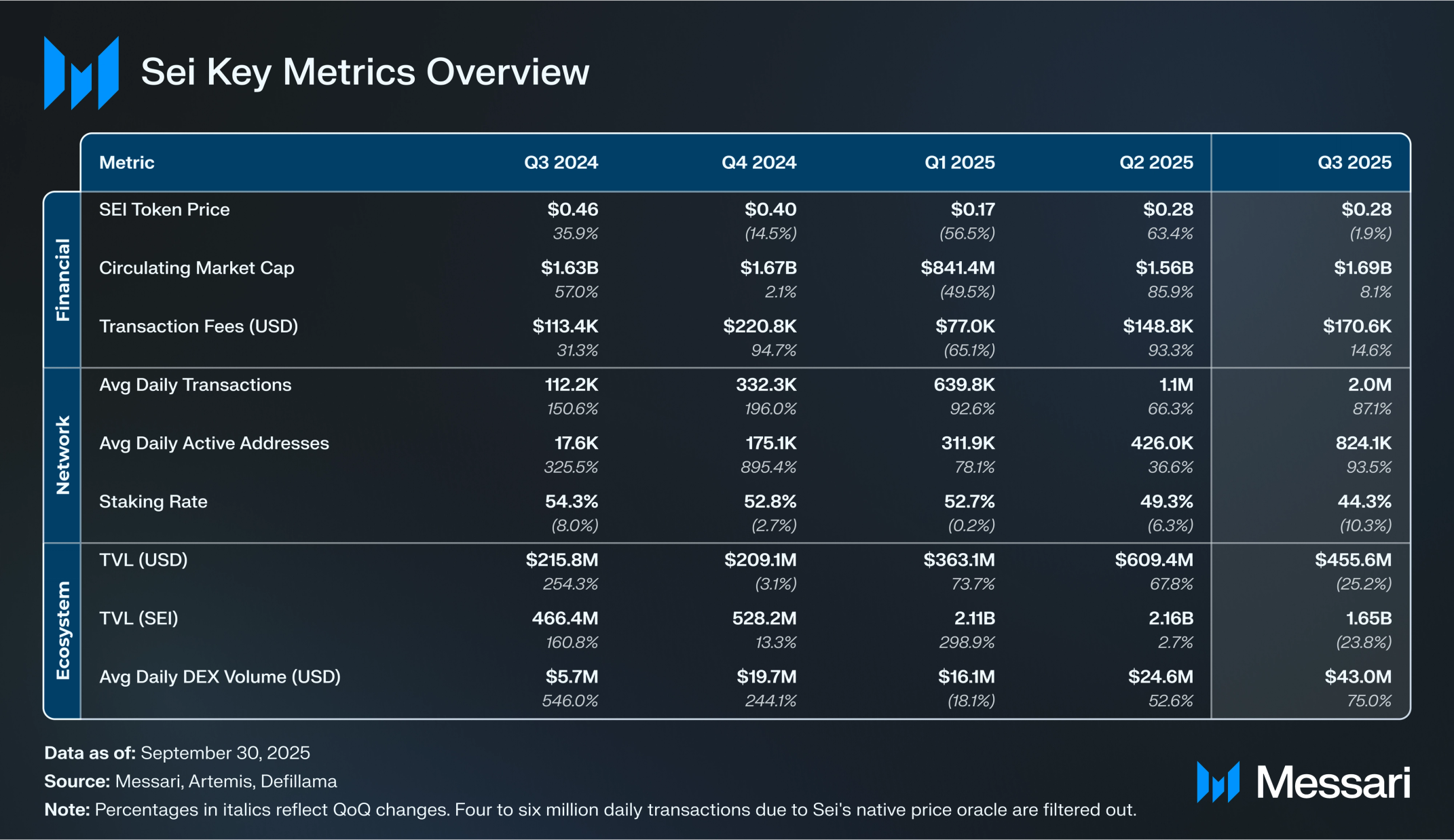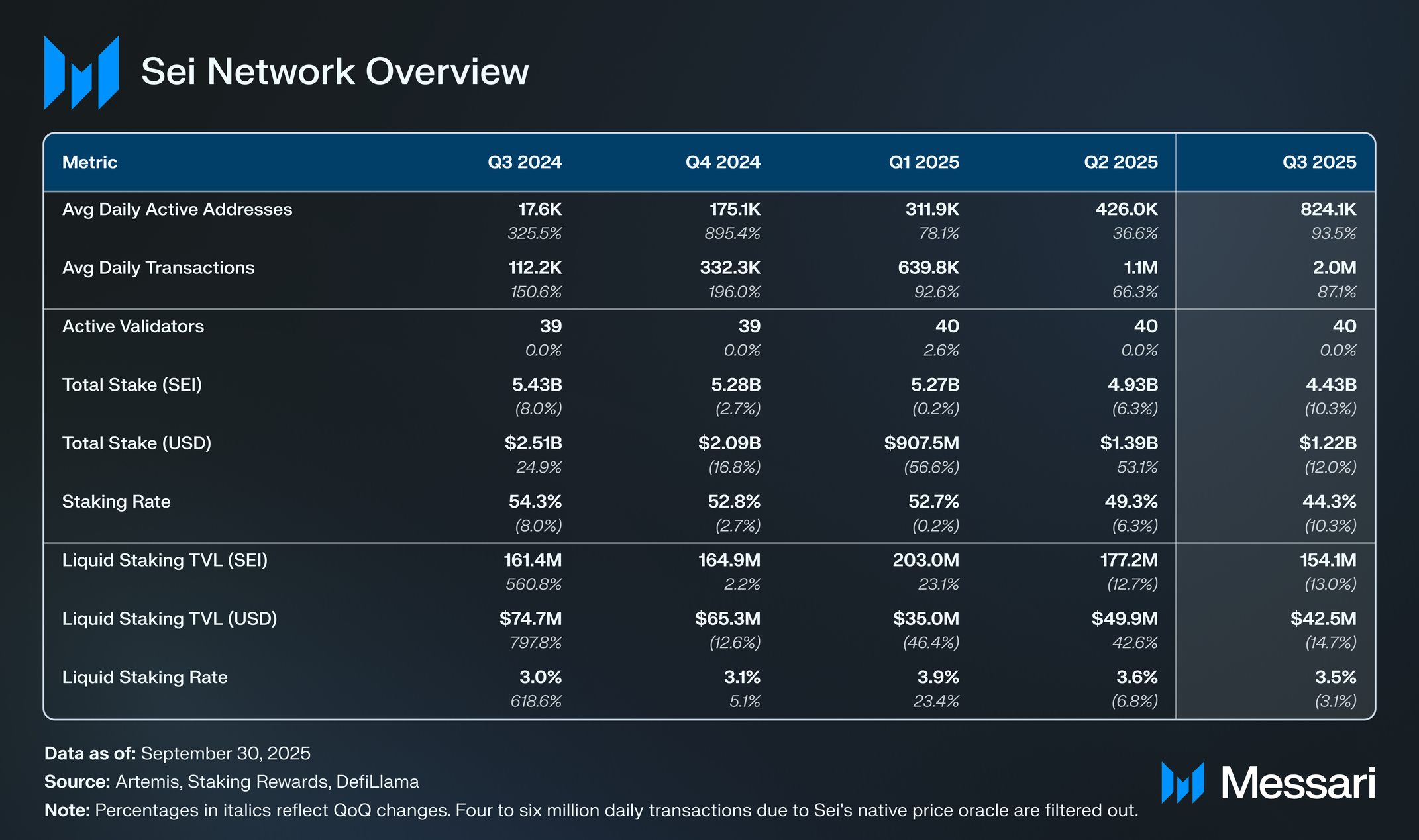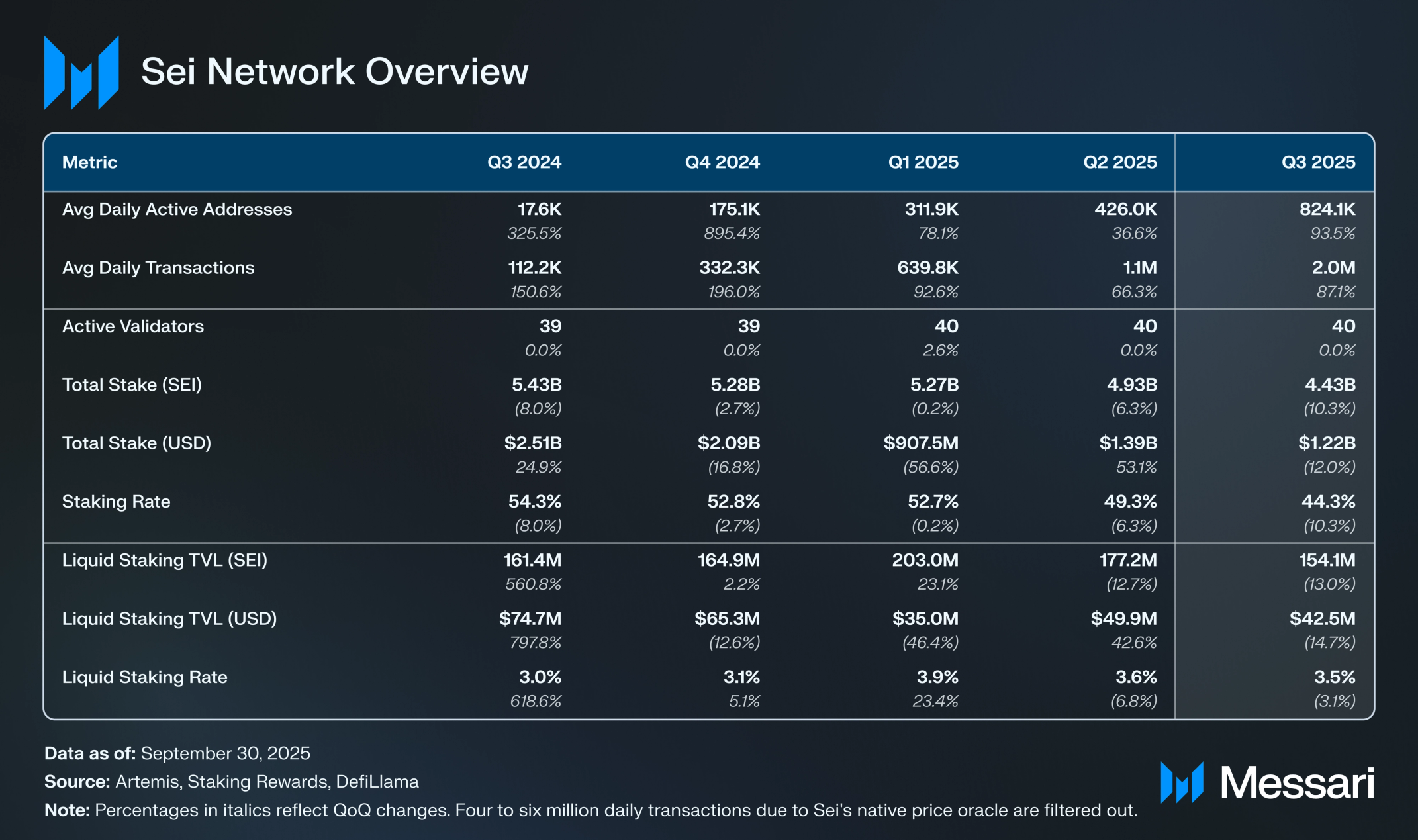 2025년 3분기 말까지 1억 5,330만 SEI가 세이에서 리퀴드 스테이킹되었으며, 이는 2025년 2분기 말까지 리퀴드 스테이킹된 1억 7,630만 SEI 대비 전분기 대비 13% 감소한 수치다. 이는 세이의 리퀴드 스테이킹 활동이 감소한 두 번째 분기였다. 세이의 총 스테이크(SEI)와 비교하여, 리퀴드 스테이킹 비율은 3.6%에서 3.5%로 감소했다.