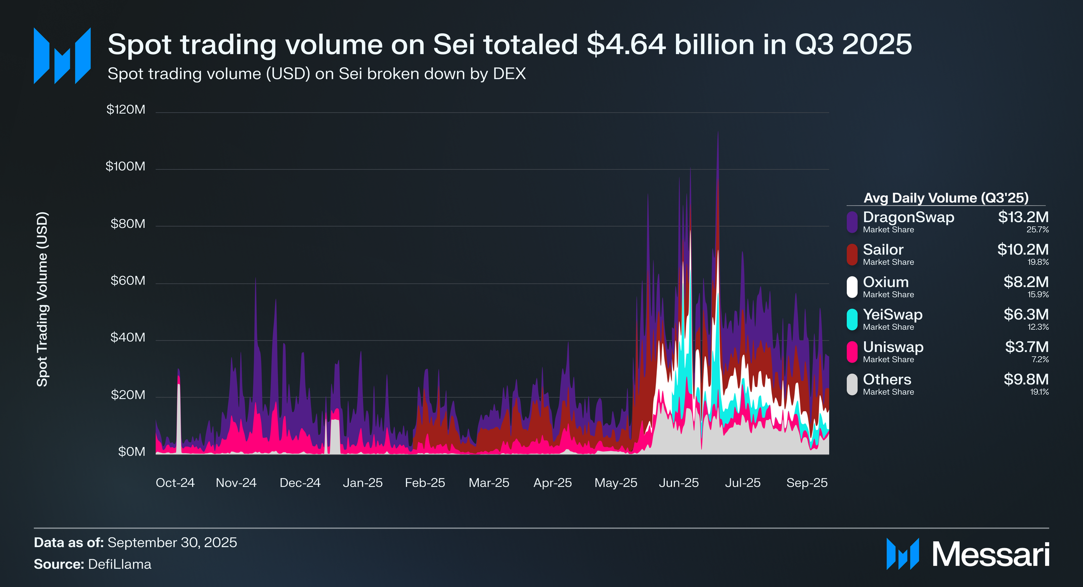 세이의 평균 일일 현물 거래량(USD)은 전분기 대비 75% 증가한 4,300만 달러를 기록했으며, 2024년 대비 2025년 내내 상승된 수준을 유지했다. 드래곤스왑은 2025년 3분기 활동을 주도하기 위해 세일러를 추월했다.